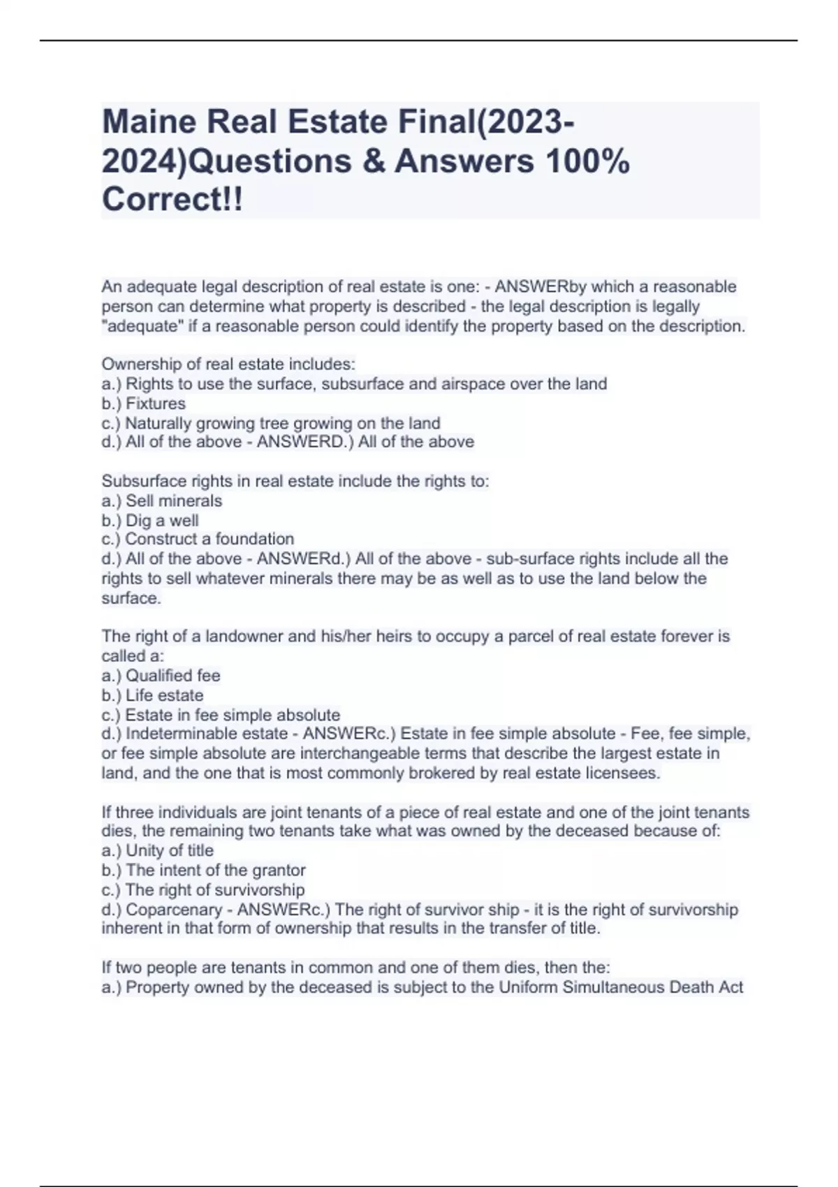 An adequate legal description of real estate is one: - ANSWERby which a reasonable person can determine what property is described - the legal description is legally "adequate" if a reasonable person could identify the property based on the description. Ownership of real estate includes: a.) Rights to use the surface, subsurface and airspace over the land b.) Fixtures c.) Naturally growing tree growing on the land d.) All of the above - ANSWERD.) All of the above Subsurface rights in real estate include the rights to: a.) Sell minerals b.) Dig a well c.) Construct a foundation d.) All of the above - ANSWERd.) All of the above - sub-surface rights include all the rights to sell whatever minerals there may be as well as to use the land below the surface. The right of a landowner and his/her heirs to occupy a parcel of real estate forever is called a: a.) Qualified fee b.) Life estate c.) Estate in fee simple absolute d.) Indeterminable estate - ANSWERc.) Estate in fee simple absolute - Fee, fee simple, or fee simple absolute are interchangeable terms that describe the largest estate in land, and the one that is most commonly brokered by real estate licensees. If three individuals are joint tenants of a piece of real estate and one of the joint tenants dies, the remaining two tenants take what was owned by the deceased because of: a.) Unity of title b.) The intent of the grantor c.) The right of survivorship d.) Coparcenary - ANSWERc.) The right of survivor ship - it is the right of survivorship inherent in that form of ownership that results in the transfer of title. If two people are tenants in common and one of them dies, then the: a.) Property owned by the deceased is subject to the Uniform Simultaneous Death Act b.) Remaining co-tenant takes through survivorship c.) Interest of the deceased passes according to his (her) will d.) None of the above - ANSWERc.) Interest of the deceased passes according to his (her) will Should the owner of a unit in a condominium be unable to meet his or her mortgage payments, the bank's foreclosure will: a.) Become a liability of the condo developer b.) Force other unit owners to come up with the money in order to protect their investment c.) Not affect the other owners d.) Both a and c - ANSWERc.) Not affect the other owners - Each unit owners mortgages his (her) own unit independently of the others. The developer is no affected by the loan of one unit owner. A purchased of a two family home will want to know what kind of lease the tenant has in order to know whether he/she can: a.) Raise the rent b.) Evict the tenant c.) Change the terms of the lease on short notice d.) All of the above - ANSWERd.) All of the above Which of the following leasehold tenancies must be in writing? a.) Tenancy at will b.