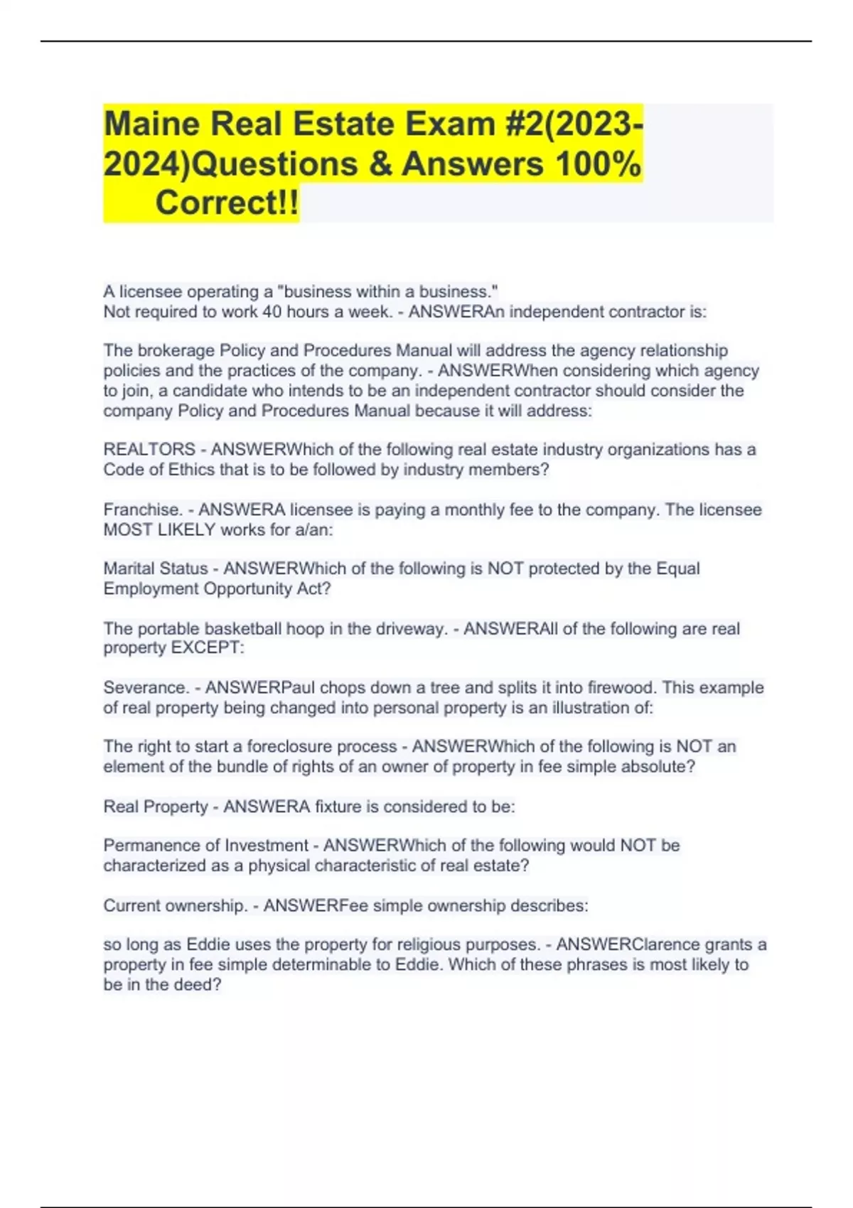 Maine Real Estate Exam #2()Questions & Answers 100% Correct!!