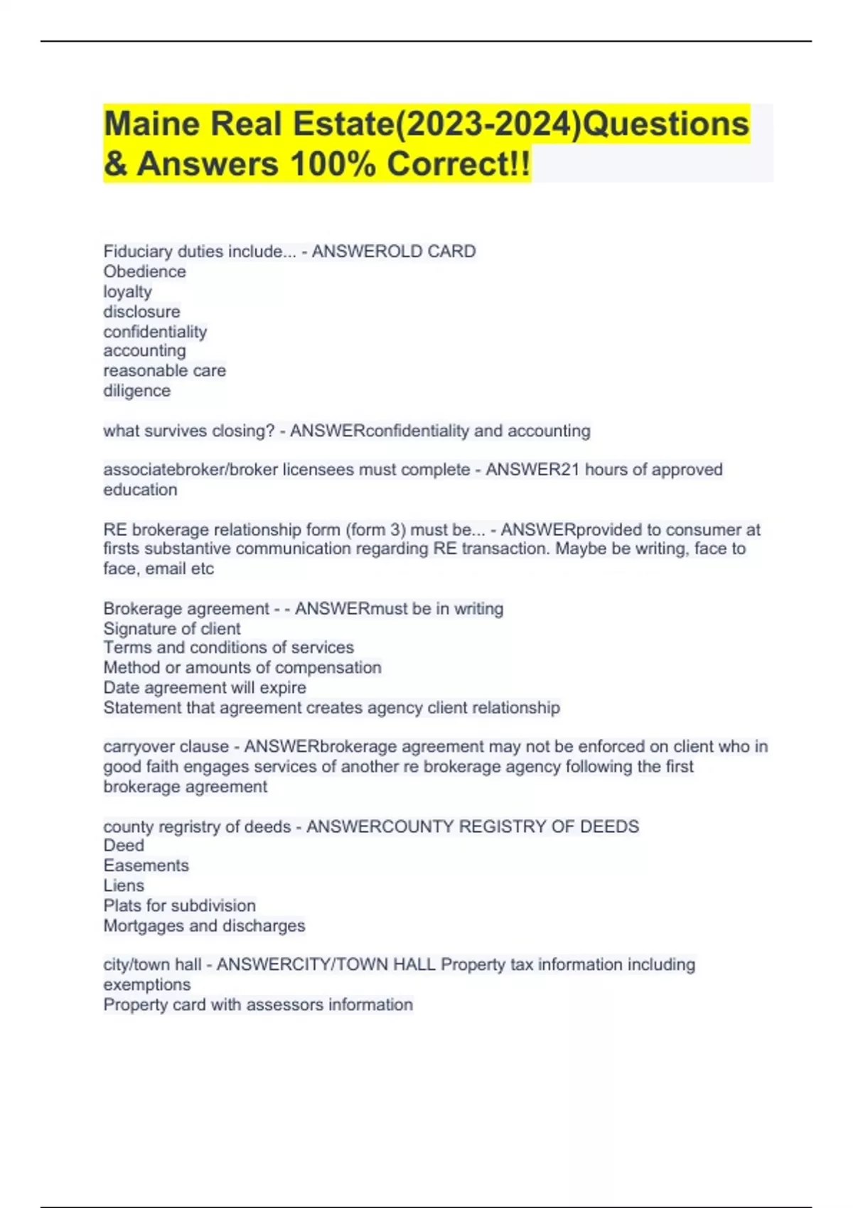 Fiduciary duties include... - ANSWEROLD CARD Obedience loyalty disclosure confidentiality accounting reasonable care diligence what survives closing? - ANSWERconfidentiality and accounting associatebroker/broker licensees must complete - ANSWER21 hours of approved education RE brokerage relationship form (form 3) must be... - ANSWERprovided to consumer at firsts substantive communication regarding RE transaction. Maybe be writing, face to face, email etc Brokerage agreement - - ANSWERmust be in writing Signature of client Terms and conditions of services Method or amounts of compensation Date agreement will expire Statement that agreement creates agency client relationship carryover clause - ANSWERbrokerage agreement may not be enforced on client who in good faith engages services of another re brokerage agency following the first brokerage agreement county regristry of deeds - ANSWERCOUNTY REGISTRY OF DEEDS Deed Easements Liens Plats for subdivision Mortgages and discharges city/town hall - ANSWERCITY/TOWN HALL Property tax information including exemptions Property card with assessors information Building permits Zoning Septic permits Conde enforcement records ad