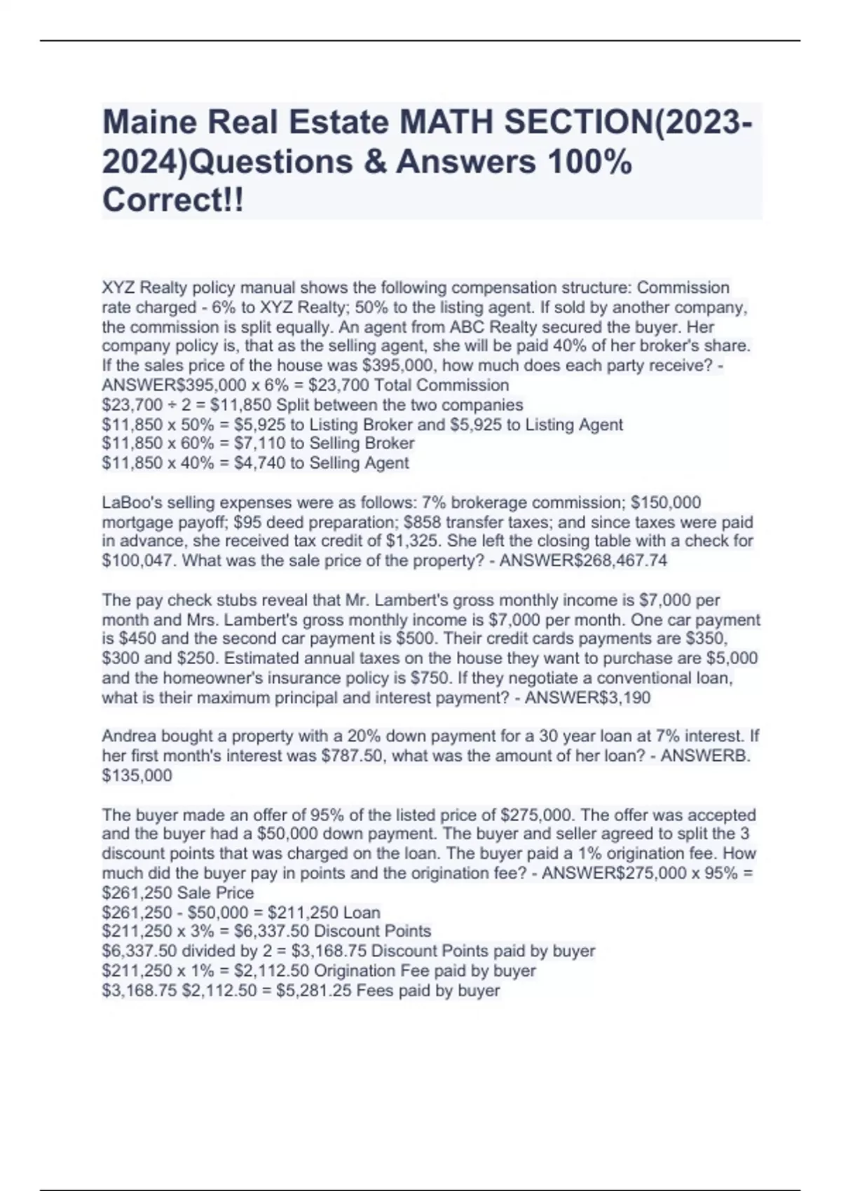 XYZ Realty policy manual shows the following compensation structure: Commission rate charged - 6% to XYZ Realty; 50% to the listing agent. If sold by another company, the commission is split equally. An agent from ABC Realty secured the buyer. Her company policy is, that as the selling agent, she will be paid 40% of her broker's share. If the sales price of the house was $395,000, how much does each party receive? - ANSWER$395,000 x 6% = $23,700 Total Commission $23,700 ÷ 2 = $11,850 Split between the two companies $11,850 x 50% = $5,925 to Listing Broker and $5,925 to Listing Agent $11,850 x 60% = $7,110 to Selling Broker $11,850 x 40% = $4,740 to Selling Agent LaBoo's selling expenses were as follows: 7% brokerage commission; $150,000 mortgage payoff; $95 deed preparation; $858 transfer taxes; and since taxes were paid in advance, she received tax credit of $1,325. She left the closing table with a check for $100,047. What was the sale price of the property? - ANSWER$268,467.74 The pay check stubs reveal that Mr. Lambert's gross monthly income is $7,000 per month and Mrs. Lambert's gross monthly income is $7,000 per month. One car payment is $450 and the second car payment is $500. Their credit cards payments are $350, $300 and $250. Estimated annual taxes on the house they want to purchase are $5,000 and the homeowner's insurance policy is $750. If they negotiate a conventional loan, what is their maximum principal and interest payment? - ANSWER$3,190 Andrea bought a property with a 20% down payment for a 30 year loan at 7% interest. If her first month's interest was $787.50, what was the amount of her loan? - ANSWERB. $135,000 The buyer made an offer of 95% of the listed price of $275,000. The offer was accepted and the buyer had a $50,000 down payment. The buyer and seller agreed to split the 3 discount points that was charged on the loan. The buyer paid a 1% origination fee. How much did the buyer pay in points and the origination fee? - ANSWER$275,000 x 95% = $261,250 Sale Price $261,250 - $50,000 = $211,250 Loan $211,250 x 3% = $6,337.50 Discount Points $6,337.50 divided by 2 = $3,168.75 Discount Points paid by buyer $211,250 x 1% = $2,112.50 Origination Fee paid by buyer $
