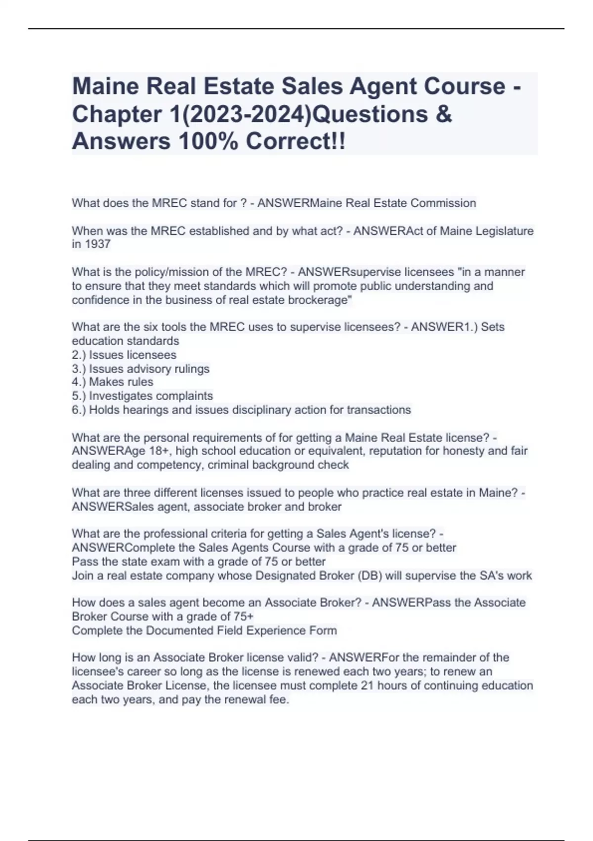 Maine Real Estate Sales Agent Course - Chapter 1()Questions & Answers 100% Correct!!