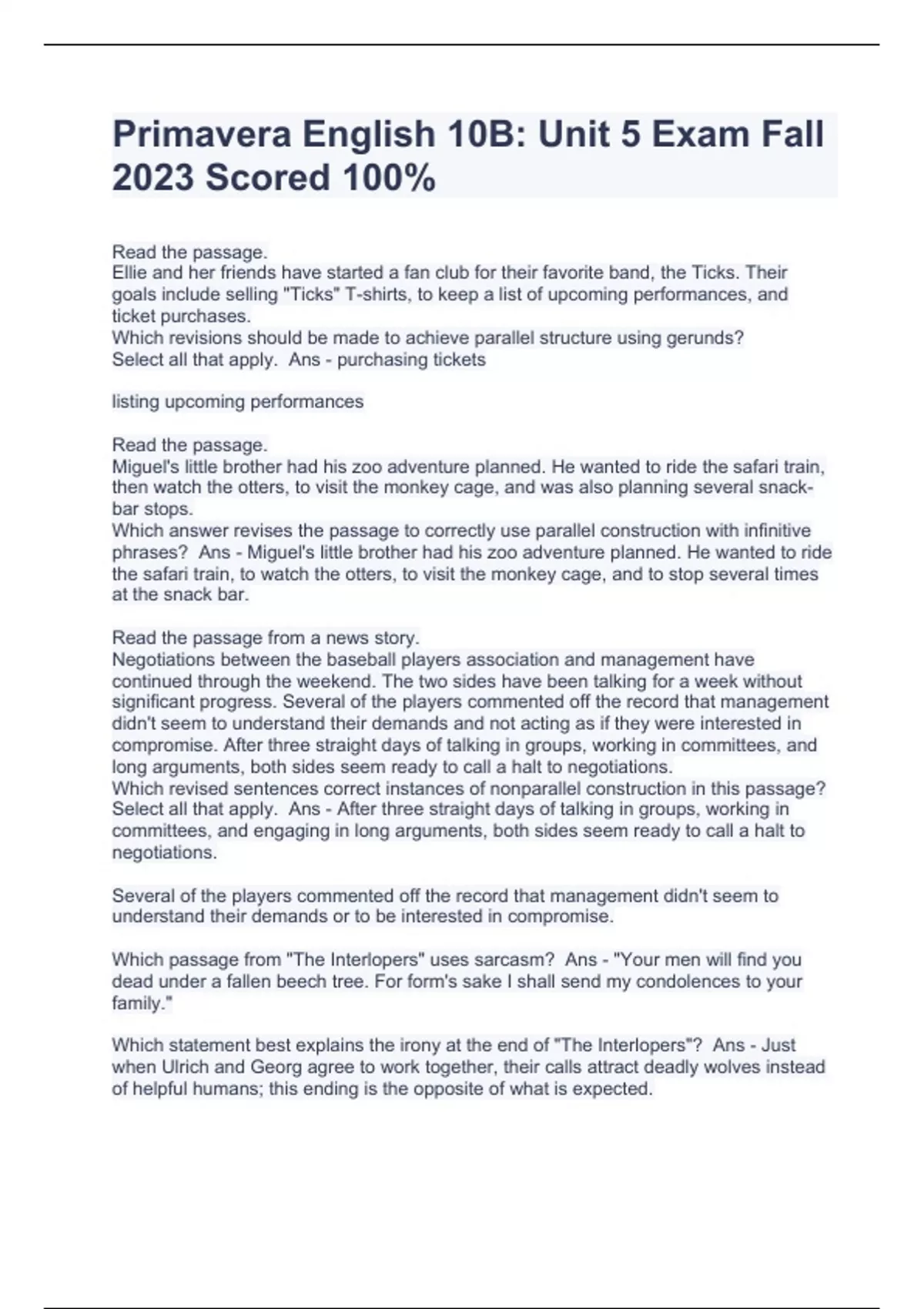 Primavera English 10B: Unit 5 Exam Fall 2023 Scored 100%