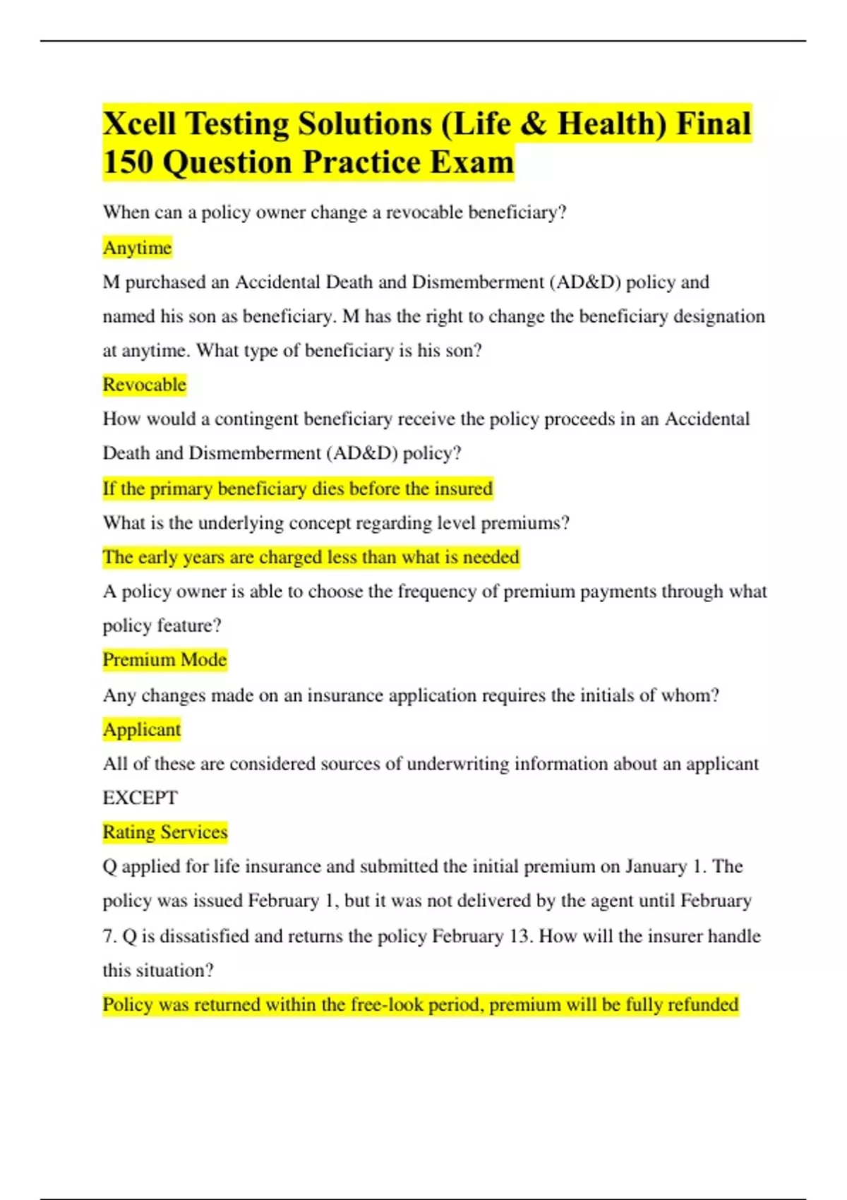 Xcell Testing Solutions (Life & Health) Final 150 Question Practice Exam Xcell Testing Solutions (Life & Health) Final 150 Question Practice Exam When can a policy owner change a revocable beneficiary? Anytime M purchased an Accidental Death and Dismemberment (AD&D) policy and named his son as beneficiary. M has the right to change the beneficiary designation at anytime. What type of beneficiary is his son? Revocable How would a contingent beneficiary receive the policy proceeds in an Accidental Death and Dismemberment (AD&D) policy? If the primary beneficiary dies before the insured What is the underlying concept regarding level premiums? The early years are charged less than what is needed A policy owner is able to choose the frequency of premium payments through what policy feature? Premium Mode Any changes made on an insurance application requires the initials of whom? Applicant All of these are considered sources of underwriting information about an applicant EXCEPT Rating Services Q applied for life insurance and submitted the initial premium on January 1. The policy was issued February 1, but it was not delivered by the agent until February 7. Q is dissatisfied and returns the policy February 13. How will the insurer handle this situation? Policy was returned within the free-look period, premium will be fully refunded M completes an application for life insurance but does not pay the initial premium. All of these actions must occur before M's policy goes into effect EXCEPT free-look period has expired What action should a producer take if the initial premium is NOT submitted with the application? Forward the application to the insurer without the initial premium Which of the following is an important underwriting principle of group life insurance? Everyone must be covered in the group Which requirement must be met for an association to be eligible for a group life plan? Group was formed for a purpose other than acquiring insurance When an employee is terminated, which statement about a group term life conversion is true? Policy proceeds will be paid if the employee dies during the conversion period Under a trustee group life policy, who would be eligible for a certificate of coverage? Corporation N, age 50, recently bought an annuity that will pay a guaranteed $2,000/month at age 70 for life. What type of annuity did N purchase?