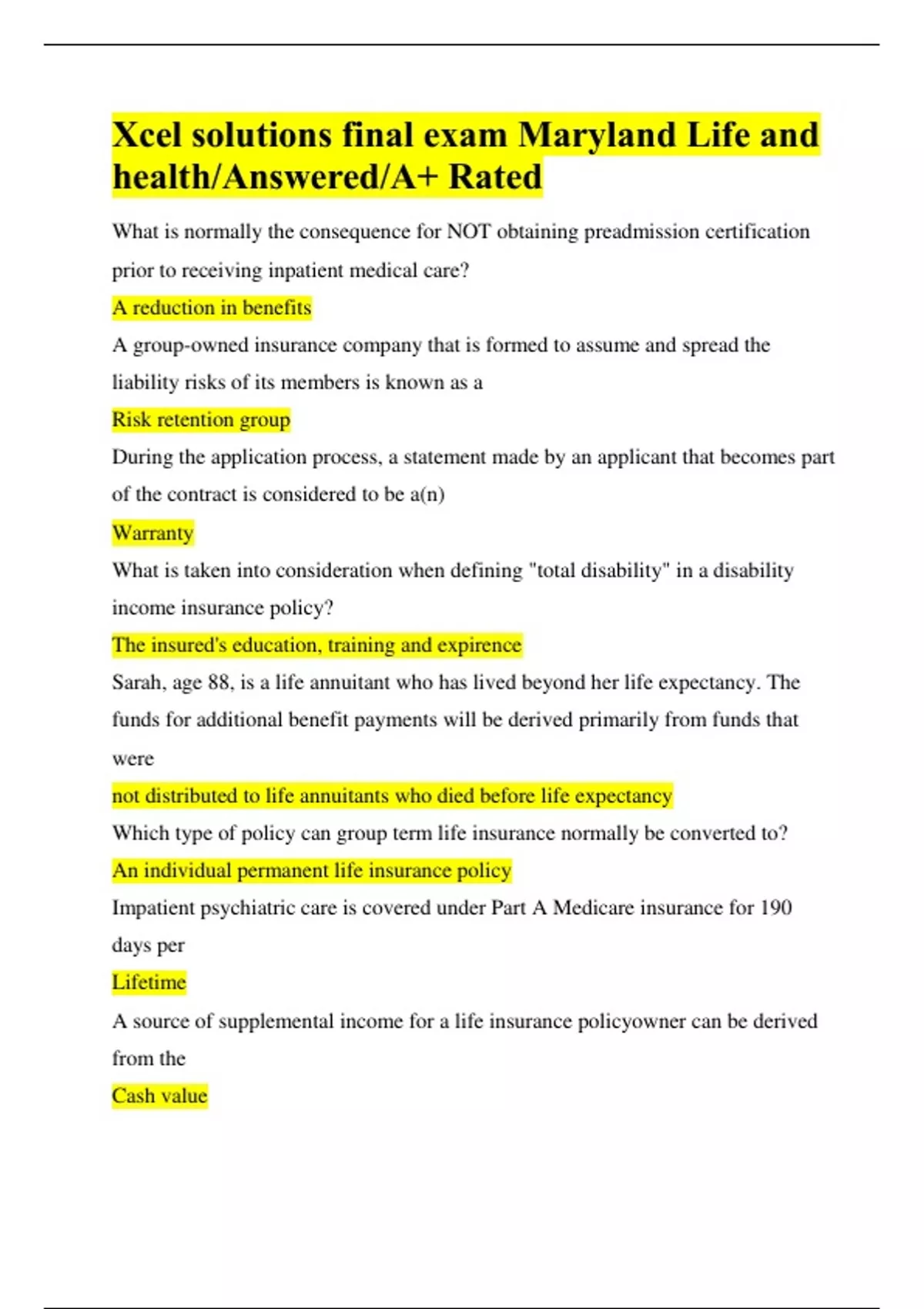 Xcel solutions final exam Maryland Life and health/Answered/A+ Rated