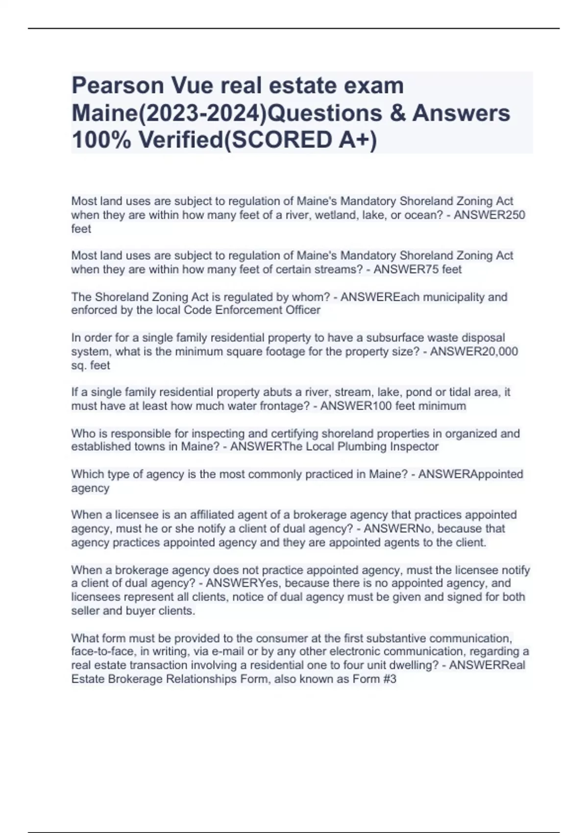 Most land uses are subject to regulation of Maine's Mandatory Shoreland Zoning Act when they are within how many feet of a river, wetland, lake, or ocean? - ANSWER250 feet Most land uses are subject to regulation of Maine's Mandatory Shoreland Zoning Act when they are within how many feet of certain streams? - ANSWER75 feet The Shoreland Zoning Act is regulated by whom? - ANSWEREach municipality and enforced by the local Code Enforcement Officer In order for a single family residential property to have a subsurface waste disposal system, what is the minimum square footage for the property size? - ANSWER20,000 sq. feet If a single family residential property abuts a river, stream, lake, pond or tidal area, it must have at least how much water frontage? - ANSWER100 feet minimum Who is responsible for inspecting and certifying shoreland properties in organized and established towns in Maine? - ANSWERThe Local Plumbing Inspector Which type of agency is the most commonly practiced in Maine? - ANSWERAppointed agency When a licensee is an affiliated agent of a brokerage agency that practices appointed agency, must he or she notify a client of dual agency? - ANSWERNo, because that agency practices appointed agency and they are appointed agents to the client. When a brokerage agency does not practice appointed agency, must the licensee notify a client of dual agency? - ANSWERYes, because there is no appointed agency, and licensees represent all clients, notice of dual agency must be given and signed for both seller and buyer clients. What form must be provided to the consumer at the first substantive communication, face-to-face, in writing, via e-mail or by any other electronic communication, regarding a real estate transaction involving a residential one to four unit dwelling? - ANSWERReal Estate Brokerage Relationships Form, also known as Form #3 Must the consumer sign Form #3, The Real Estate Brokerage Relationship Form? - ANSWERNo, the Maine Real Estate Commission does not require the consumer's signature on this form. The following must be included in what type of Brokerage Contract? The signature of the client to be charged • The terms and conditions of the brokerage services to be provided • The method or amount of compensation to be paid • The date upon which the agreement will expire • A statement that the agreement creates an agency-client relationship - ANSWERA Brokerage Contract with a seller In Maine, the Carryover Clause caps extending a real estate brokerage agency's right to a fee following expiration of the brokerage agreement at how many months? - ANSWER6 months
