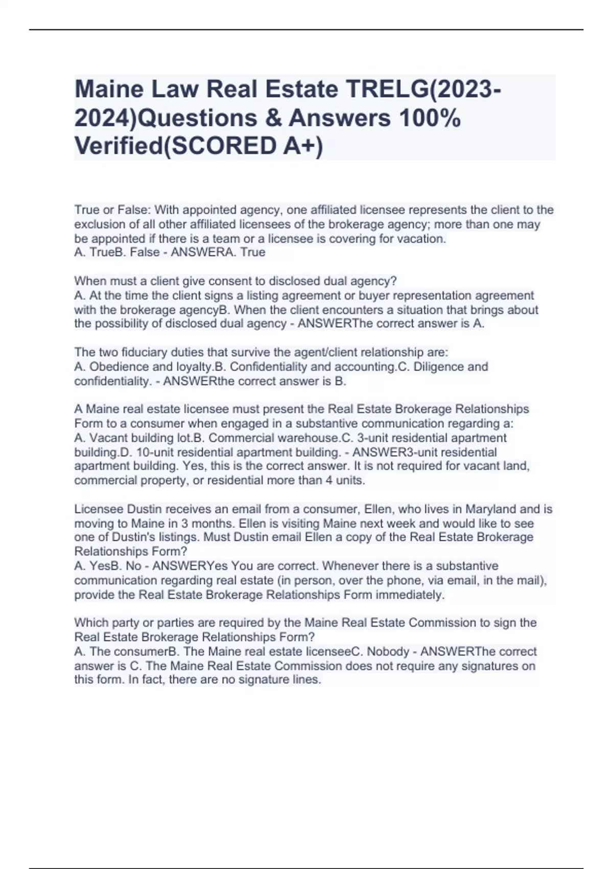 Maine Law Real Estate TRELG()Questions & Answers 100% Verified(SCORED A+)