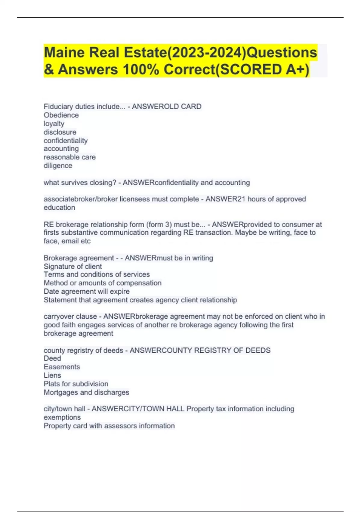 Fiduciary duties include... - ANSWEROLD CARD Obedience loyalty disclosure confidentiality accounting reasonable care diligence what survives closing? - ANSWERconfidentiality and accounting associatebroker/broker licensees must complete - ANSWER21 hours of approved education RE brokerage relationship form (form 3) must be... - ANSWERprovided to consumer at firsts substantive communication regarding RE transaction. Maybe be writing, face to face, email etc Brokerage agreement - - ANSWERmust be in writing Signature of client Terms and conditions of services Method or amounts of compensation Date agreement will expire Statement that agreement creates agency client relationship carryover clause - ANSWERbrokerage agreement may not be enforced on client who in good faith engages services of another re brokerage agency following the first brokerage agreement county regristry of deeds - ANSWERCOUNTY REGISTRY OF DEEDS Deed Easements Liens Plats for subdivision Mortgages and discharges city/town hall - ANSWERCITY/TOWN HALL Property tax information including exemptions Property card with assessors information Building permits Zoning Septic permits Conde enforcement records