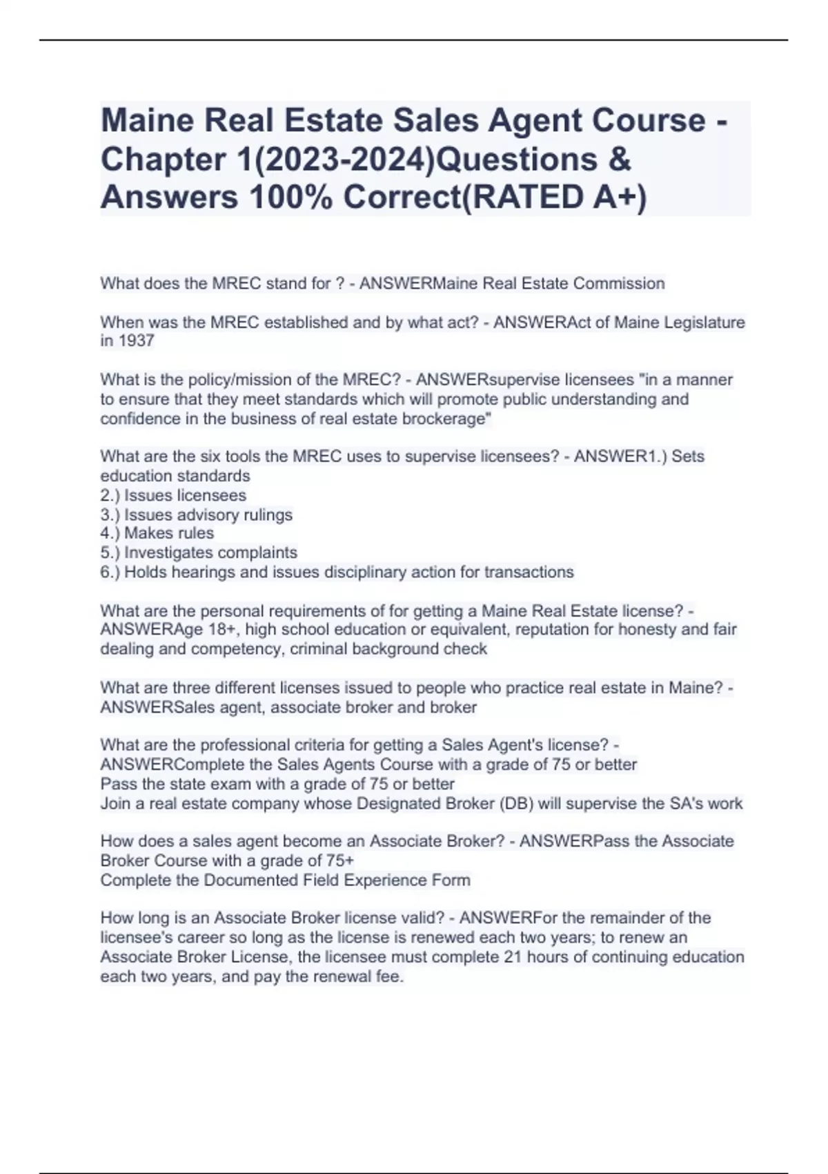 Maine Real Estate Sales Agent Course - Chapter 1()Questions & Answers 100% Correct(RATED A+)