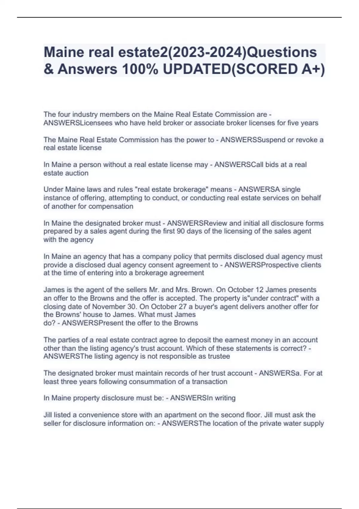 Maine real estate2()Questions & Answers 100% UPDATED(SCORED A+)