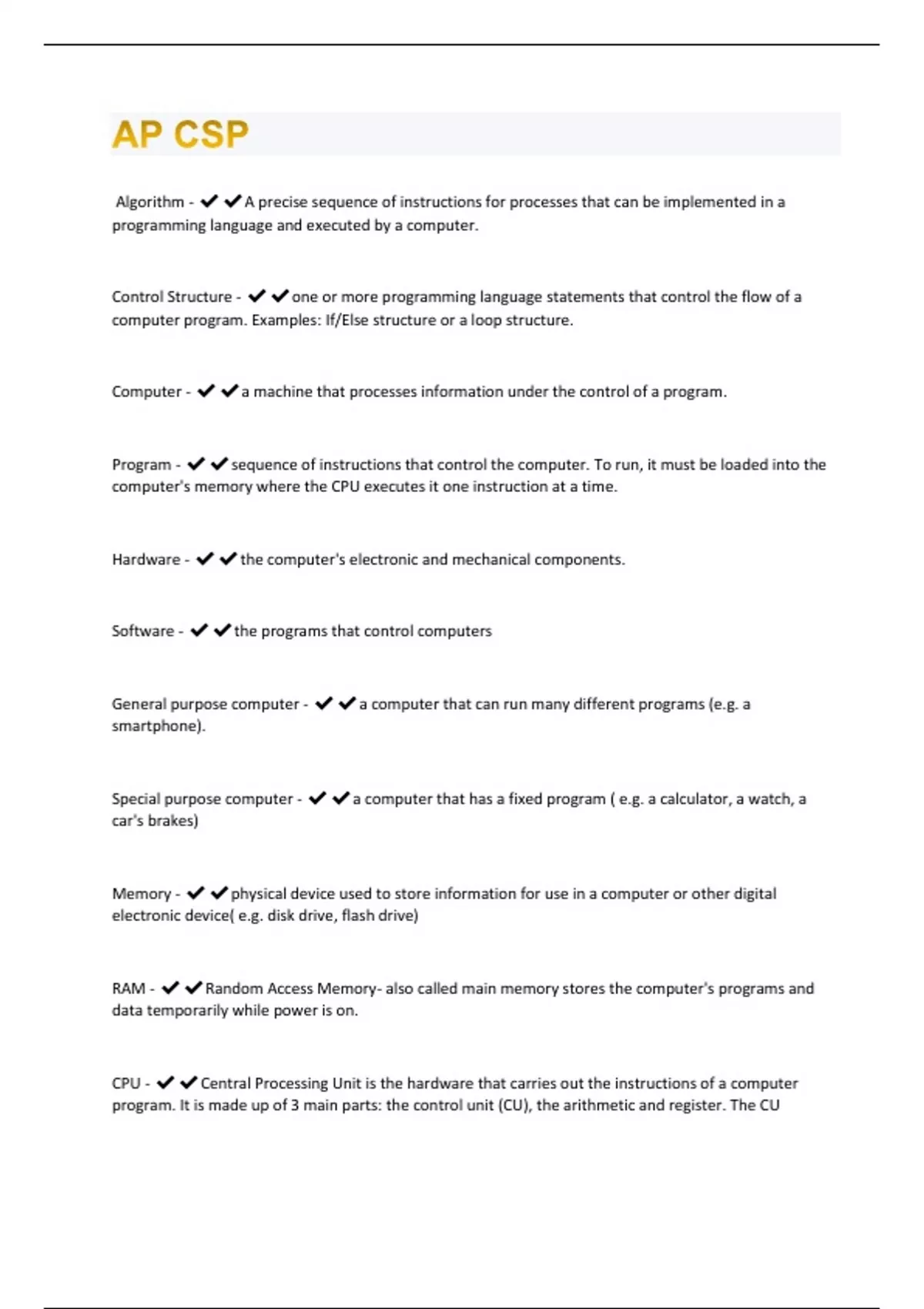 Algorithm - A precise sequence of instructions for processes that can be implemented in a programming language and executed by a computer. Control Structure - one or more programming language statements that control the flow of a computer program. Examples: If/Else structure or a loop structure. Computer - a machine that processes information under the control of a program. Program - sequence of instructions that control the computer. To run, it must be loaded into the computer's memory where the CPU executes it one instruction at a time. Hardware - the computer's electronic and mechanical components. Software - the programs that control computers General purpose computer - a computer that can run many different programs (e.g. a smartphone). Special purpose computer - a computer that has a fixed program ( e.g. a calculator, a watch, a car's brakes) Memory - physical device used to store information for use in a computer or other digital electronic device( e.g. disk drive, flash drive) RAM - Random Access Memory- also called main memory stores the computer's programs and data temporarily while power is on. CPU - Central Processing Unit is the hardware that carries out the instructions of a computer program. It is made up of 3 main parts: the control unit (CU), the arithmetic and register. The CUprocesses the program's instructions, the ALU (arithmetic logic unit) performs the arithmetic and logic operations and the register stores intermediate data during program execution. Input devices - bring data and programs into the computer (e.g. mouse, keyboard) Output devices - transmit data to other computers to users (e.g. printer, monitor, speaker) Motherboard - houses the computer's main electronic components