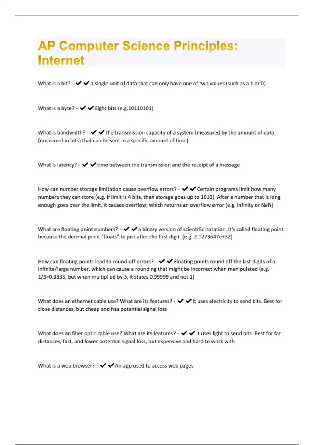 hat is a bit? - a single unit of data that can only have one of two values (such as a 1 or 0) What is a byte? - Eight bits (e.g.) What is bandwidth? - the transmission capacity of a system (measured by the amount of data (measured in bits) that can be sent in a specific amount of time) What is latency? - time between the transmission and the receipt of a message How can number storage limitation cause overflow errors? - Certain programs limit how many numbers they can store (e.g. if limit is 4 bits, then storage goes up to 1010). After a number that is long enough goes over the limit, it causes overflow, which returns an overflow error (e.g. infinity or NaN) What are floating point numbers? - a binary version of scientific notation. It's called floating point because the decimal point "floats" to just after the first digit. (e.g. 2.1273647e+32) How can floating points lead to round-off errors? - Floating points round off the last digits of a infinite/large number, which can cause a rounding that might be incorrect when manipulated (e.g. 1/3=0.3333, but when multiplied by 3, it states 0.99999 and not 1) What does an ethernet cable use? What are its features? - It uses electricity to send bits. Best for close distances, but cheap and has potential signal loss What does an fiber optic cable use? What are its features? - It uses light to send bits. Best for far distances, fast, and lower potential signal loss, but expensive and hard to work with What is a web browser? - An app used to access web pagesWhat is an URL? - Uniform Resource Locator: an address for accessing specific web data located on a server What is a DNS server? - Domain Name System server: a computer or computers hosting data for other to access What is HTTP? - HyperText Transfer Protocol: language used to communicate between web browsers and servers What is HTML? - HyperText Markup Language: language used to tell a web browser how to make a page look What two components does HTML decide seperately? - (1) the text on the web page (2) each seperate picture and video (a seperate HTML code for every one of those) What are the steps of accessing a web page? - (1) Open web browser (2) type in URL or other (3) HTTP code [get () request] is sent to DNS (4) DNS returns HTTP containing HTML files to make up page