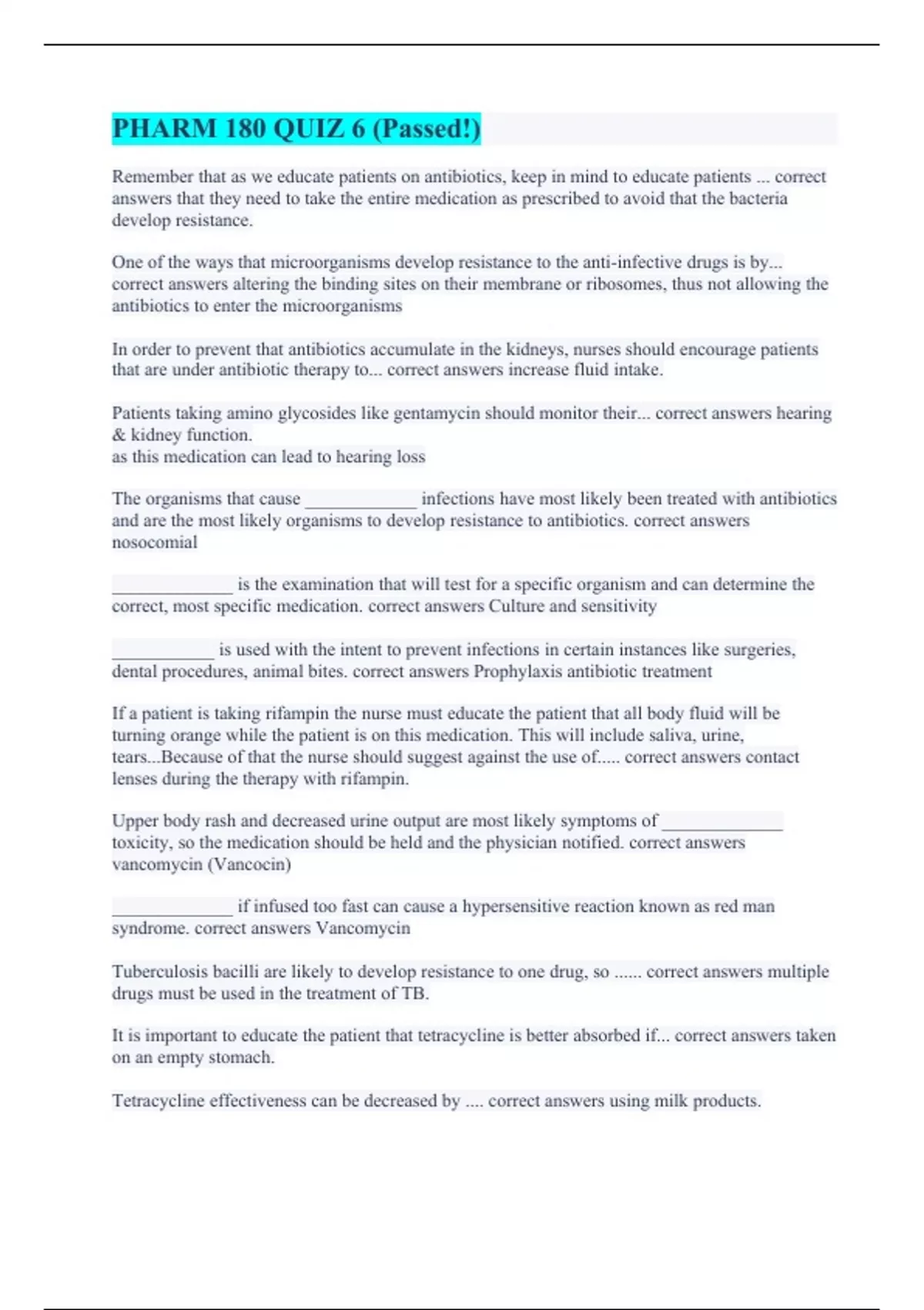 Remember that as we educate patients on antibiotics, keep in mind to educate patients ... correct answers that they need to take the entire medication as prescribed to avoid that the bacteria develop resistance. One of the ways that microorganisms develop resistance to the anti-infective drugs is by... correct answers altering the binding sites on their membrane or ribosomes, thus not allowing the antibiotics to enter the microorganisms In order to prevent that antibiotics accumulate in the kidneys, nurses should encourage patients that are under antibiotic therapy to... correct answers increase fluid intake. Patients taking amino glycosides like gentamycin should monitor their... correct answers hearing & kidney function. as this medication can lead to hearing loss The organisms that cause ____________ infections have most likely been treated with antibiotics and are the most likely organisms to develop resistance to antibiotics. correct answers nosocomial _____________ is the examination that will test for a specific organism and can determine the correct, most specific medication. correct answers Culture and sensitivity ___________ is used with the intent to prevent infections in certain instances like surgeries, dental procedures, animal bites. correct answers Prophylaxis antibiotic treatment If a patient is taking rifampin the nurse must educate the patient that all body fluid will be turning orange while the patient is on this medication. This will include saliva, urine, tears...Because of that the nurse should suggest against the use of..... correct answers contact lenses during the therapy with rifampin. Upper body rash and decreased urine output are most likely symptoms of _____________ toxicity, so the medication should be held and the physician notified. correct answers vancomycin (Vancocin) _____________ if infused too fast can cause a hypersensitive reaction known as red man syndrome. correct answers Vancomycin Tuberculosis bacilli are likely to develop resistance to one drug, so ...... correct answers multiple drugs must be used in the treatment of TB. It is important to educate the patient that tetracycline is better absorbed if... correct answers taken on an empty stomach. Tetracycline effectiveness can be decreased by .... correct answers using milk products.