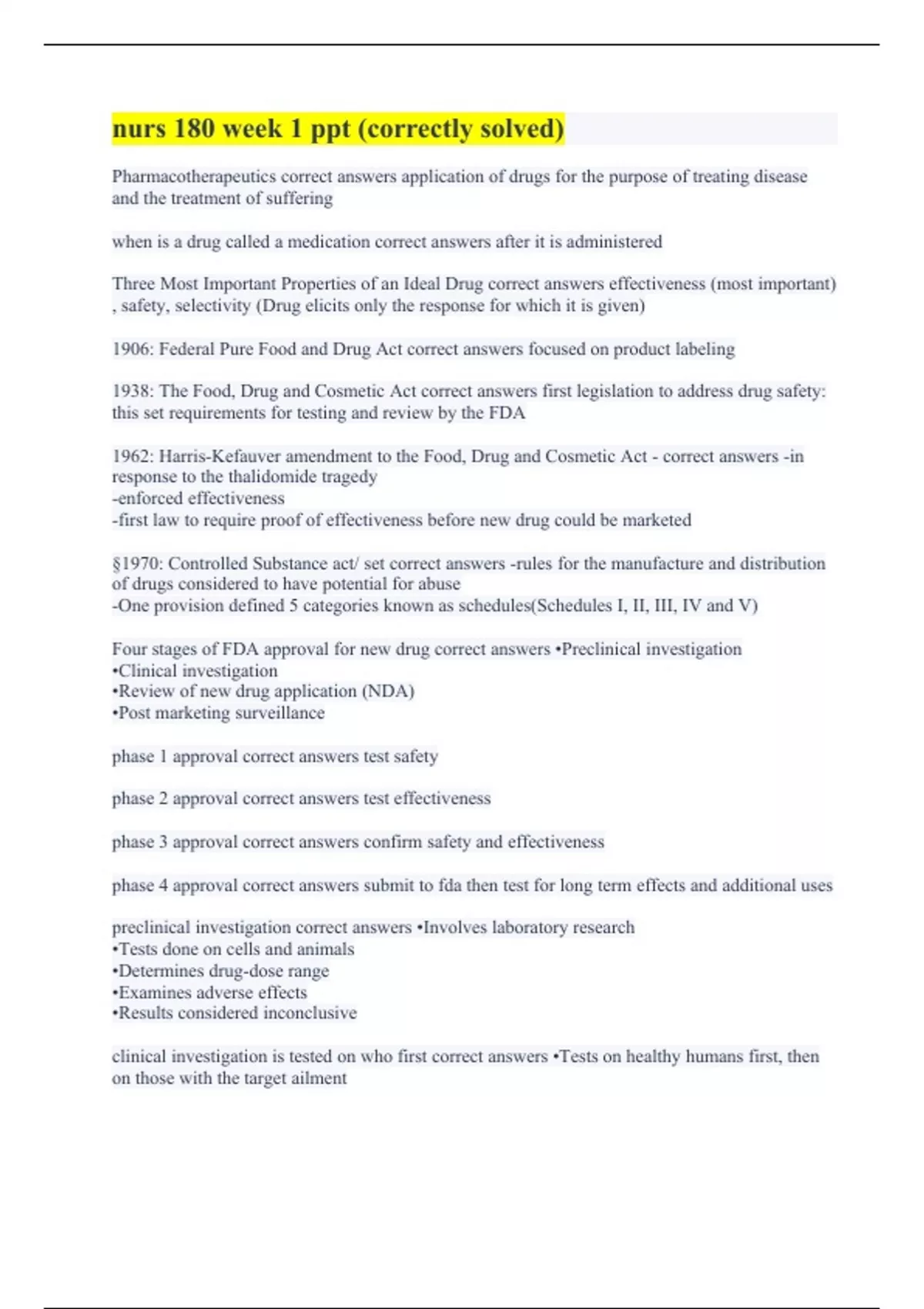 Pharmacotherapeutics correct answers application of drugs for the purpose of treating disease and the treatment of suffering when is a drug called a medication correct answers after it is administered Three Most Important Properties of an Ideal Drug correct answers effectiveness (most important) , safety, selectivity (Drug elicits only the response for which it is given) 1906: Federal Pure Food and Drug Act correct answers focused on product labeling 1938: The Food, Drug and Cosmetic Act correct answers first legislation to address drug safety: this set requirements for testing and review by the FDA 1962: Harris-Kefauver amendment to the Food, Drug and Cosmetic Act - correct answers -in response to the thalidomide tragedy -enforced effectiveness -first law to require proof of effectiveness before new drug could be marketed §1970: Controlled Substance act/ set correct answers -rules for the manufacture and distribution of drugs considered to have potential for abuse -One provision defined 5 categories known as schedules(Schedules I, II, III, IV and V) Four stages of FDA approval for new drug correct answers •Preclinical investigation •Clinical investigation •Review of new drug application (NDA) •Post marketing surveillance phase 1 approval correct answers test safety phase 2 approval correct answers test effectiveness phase 3 approval correct answers confirm safety and effectiveness phase 4 approval correct answers submit to fda then test for long term effects and additional uses preclinical investigation correct answers •Involves laboratory research •Tests done on cells and animals •Determines drug-dose range •Examines adverse effects •Results considered inconclusive clinical investigation is tested on who first correct answers •Tests on healthy humans first, then on those with the target ailment