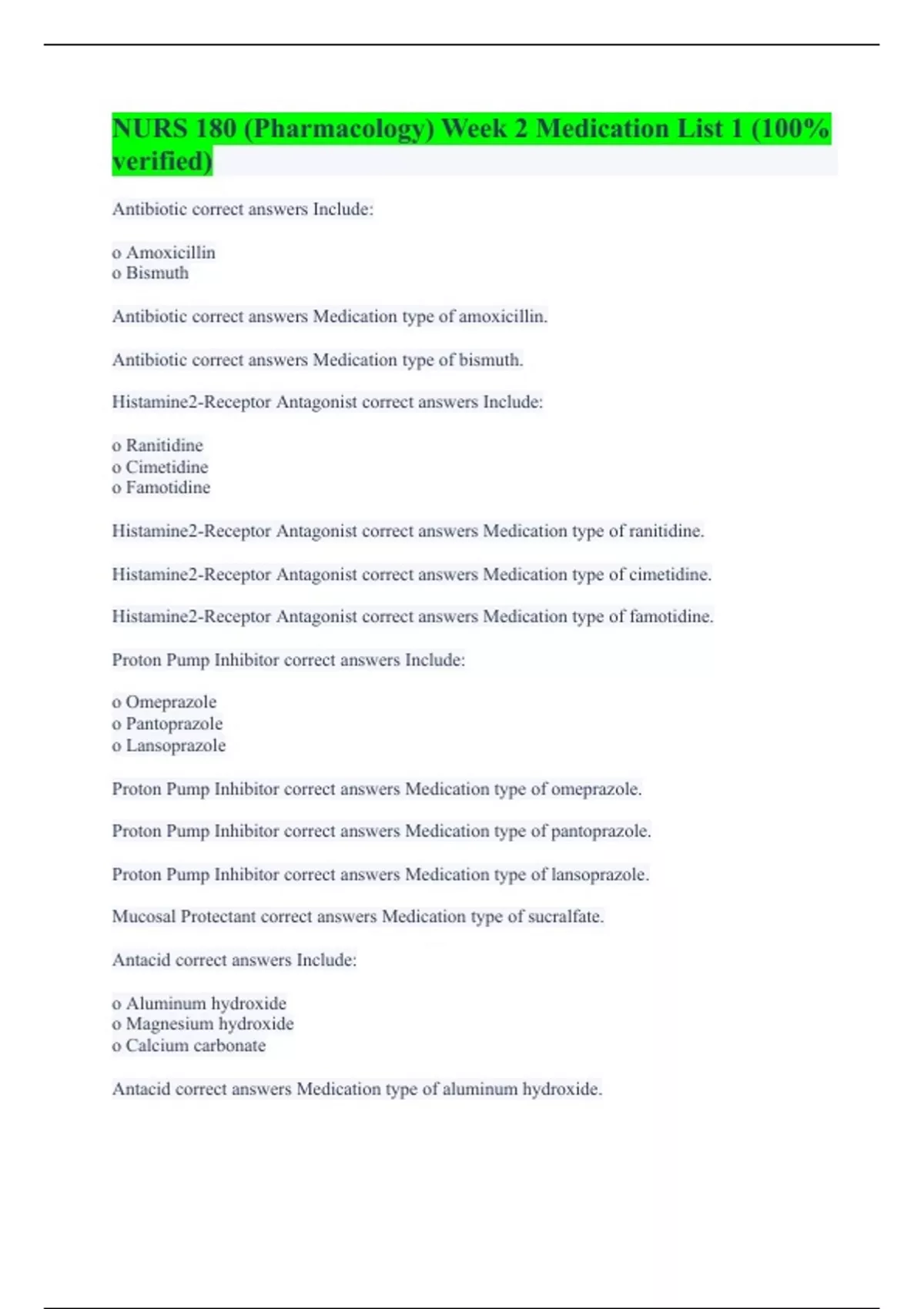 Antibiotic correct answers Include: o Amoxicillin o Bismuth Antibiotic correct answers Medication type of amoxicillin. Antibiotic correct answers Medication type of bismuth. Histamine2-Receptor Antagonist correct answers Include: o Ranitidine o Cimetidine o Famotidine Histamine2-Receptor Antagonist correct answers Medication type of ranitidine. Histamine2-Receptor Antagonist correct answers Medication type of cimetidine. Histamine2-Receptor Antagonist correct answers Medication type of famotidine. Proton Pump Inhibitor correct answers Include: o Omeprazole o Pantoprazole o Lansoprazole Proton Pump Inhibitor correct answers Medication type of omeprazole. Proton Pump Inhibitor correct answers Medication type of pantoprazole. Proton Pump Inhibitor correct answers Medication type of lansoprazole. Mucosal Protectant correct answers Medication type of sucralfate. Antacid correct answers Include: o Aluminum hydroxide o Magnesium hydroxide o Calcium carbonate Antacid correct answers Medication type of aluminum hydroxide.