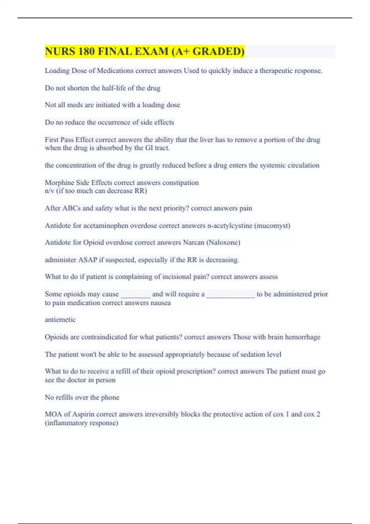 Loading Dose of Medications correct answers Used to quickly induce a therapeutic response. Do not shorten the half-life of the drug Not all meds are initiated with a loading dose Do no reduce the occurrence of side effects First Pass Effect correct answers the ability that the liver has to remove a portion of the drug when the drug is absorbed by the GI tract. the concentration of the drug is greatly reduced before a drug enters the systemic circulation Morphine Side Effects correct answers constipation n/v (if too much can decrease RR) After ABCs and safety what is the next priority? correct answers pain Antidote for acetaminophen overdose correct answers n-acetylcystine (mucomyst) Antidote for Opioid overdose correct answers Narcan (Naloxone) administer ASAP if suspected, especially if the RR is decreasing. What to do if patient is complaining of incisional pain? correct answers assess Some opioids may cause ________ and will require a _____________ to be administered prior to pain medication correct answers nausea antiemetic Opioids are contraindicated for what patients? correct answers Those with brain hemorrhage The patient won't be able to be assessed appropriately because of sedation level What to do to receive a refill of their opioid prescription? correct answers The patient must go see the doctor in person No refills over the phone MOA of Aspirin correct answers irreversibly blocks the protective action of cox 1 and cox 2 (inflammatory response)