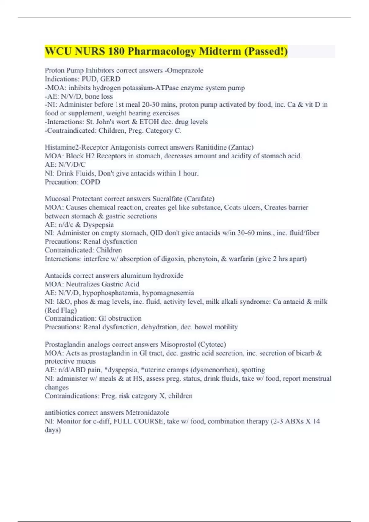 Proton Pump Inhibitors correct answers -Omeprazole Indications: PUD, GERD -MOA: inhibits hydrogen potassium-ATPase enzyme system pump -AE: N/V/D, bone loss -NI: Administer before 1st meal 20-30 mins, proton pump activated by food, inc. Ca & vit D in food or supplement, weight bearing exercises -Interactions: St. John's wort & ETOH dec. drug levels -Contraindicated: Children, Preg. Category C. Histamine2-Receptor Antagonists correct answers Ranitidine (Zantac) MOA: Block H2 Receptors in stomach, decreases amount and acidity of stomach acid. AE: N/V/D/C NI: Drink Fluids, Don't give antacids within 1 hour. Precaution: COPD Mucosal Protectant correct answers Sucralfate (Carafate) MOA: Causes chemical reaction, creates gel like substance, Coats ulcers, Creates barrier between stomach & gastric secretions AE: n/d/c & Dyspepsia NI: Administer on empty stomach, QID don't give antacids w/in 30-60 mins., inc. fluid/fiber Precautions: Renal dysfunction Contraindicated: Children Interactions: interfere w/ absorption of digoxin, phenytoin, & warfarin (give 2 hrs apart) Antacids correct answers aluminum hydroxide MOA: Neutralizes Gastric Acid AE: N/V/D, hypophosphatemia, hypomagnesemia NI: I&O, phos & mag levels, inc. fluid, activity level, milk alkali syndrome: Ca antacid & milk (Red Flag) Contraindication: GI obstruction Precautions: Renal dysfunction, dehydration, dec. bowel motility Prostaglandin analogs correct answers Misoprostol (Cytotec) MOA: Acts as prostaglandin in GI tract, dec. gastric acid secretion, inc. secretion of bicarb & protective mucus AE: n/d/ABD pain, *dyspepsia, *uterine cramps (dysmenorrhea), spotting NI: administer w/ meals & at HS, assess preg. status, drink fluids, take w/ food, report menstrual changes Contraindications: Preg. risk category X, children antibiotics correct answers Metronidazole NI: Monitor for c-diff, FULL COURSE, take w/ food, combination therapy (2-3 ABXs X 14 days)
