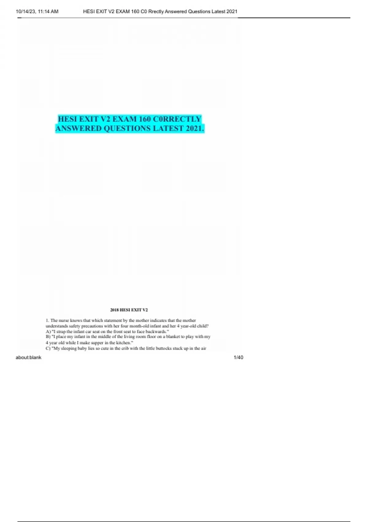hesi exit v2 exam 160 c0rrectly answered questions