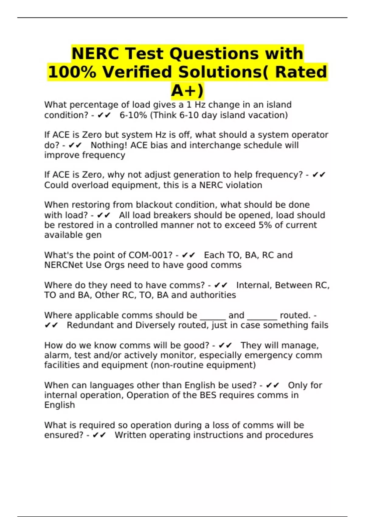 NERC Test Questions with 100% Verified Solutions( Rated A+)