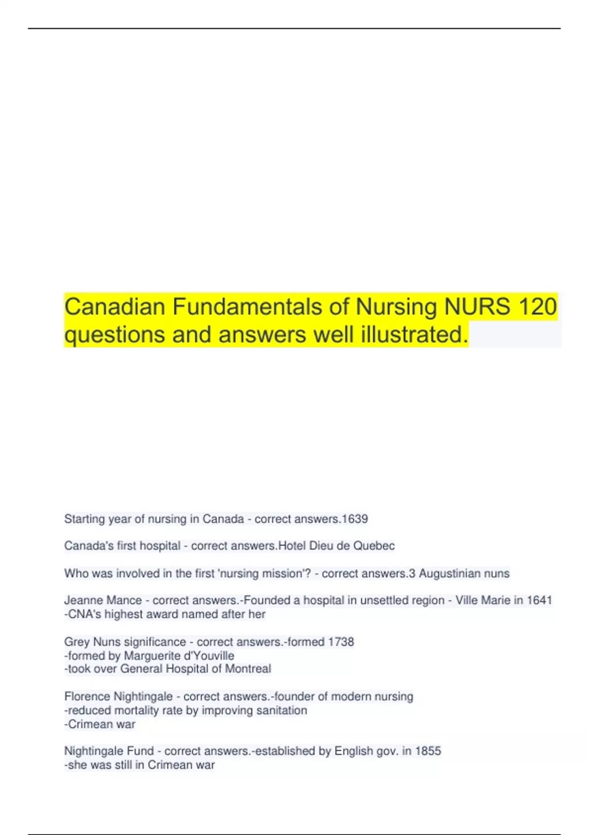 Canadian Fundamentals of Nursing NURS 120 questions and answers well illustrated. Starting year of nursing in Canada - correct answers.1639 Canada's first hospital - correct answers.Hotel Dieu de Quebec Who was involved in the first 'nursing mission'? - correct answers.3 Augustinian nuns Jeanne Mance - correct answers.-Founded a hospital in unsettled region - Ville Marie in 1641 -CNA's highest award named after her Grey Nuns significance - correct answers.-formed 1738 -formed by Marguerite d'Youville -took over General Hospital of Montreal Florence Nightingale - correct answers.-founder of modern nursing -reduced mortality rate by improving sanitation -Crimean war Nightingale Fund - correct answers.-established by English gov. in 1855 -she was still in Crimean war