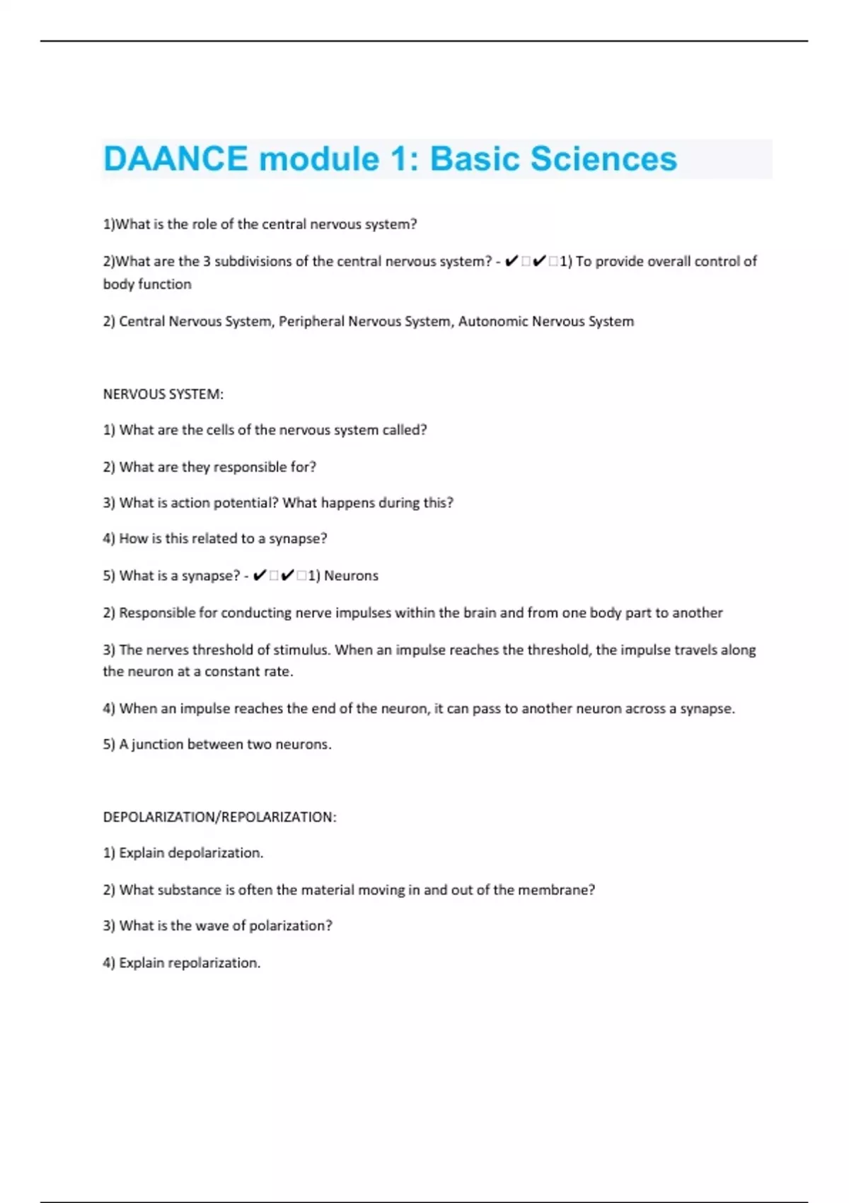 1)What is the role of the central nervous system? 2)What are the 3 subdivisions of the central nervous system? - ️️1) To provide overall control of body function 2) Central Nervous System, Peripheral Nervous System, Autonomic Nervous System NERVOUS SYSTEM: 1) What are the cells of the nervous system called? 2) What are they responsible for? 3) What is action potential? What happens during this? 4) How is this related to a synapse? 5) What is a synapse? - ️️1) Neurons 2) Responsible for conducting nerve impulses within the brain and from one body part to another 3) The nerves threshold of stimulus. When an impulse reaches the threshold, the impulse travels along the neuron at a constant rate. 4) When an impulse reaches the end of the neuron, it can pass to another neuron across a synapse. 5) A junction between two neurons. DEPOLARIZATION/REPOLARIZATION: 1) Explain depolarization. 2) What substance is often the material moving in and out of the membrane? 3) What is the wave of polarization? 4) Explain repolarization. 5) How does this relate to local anesthetics? - ️️1) The outside of a nerve membrane is positively charged. When those charges move into the membrane, the outside is left negatively charged. 2) Na+ ions 3) The movement of changing charges during depolarization. 4) After the nerve impulse passes through the nerve, the nerve fibers become repolarized, or positively charged, again. 5) Local anesthetics interfere with Na+ ions traveling through the ion channels, preventing depolarization and slowing or stopping the nerve impulses.