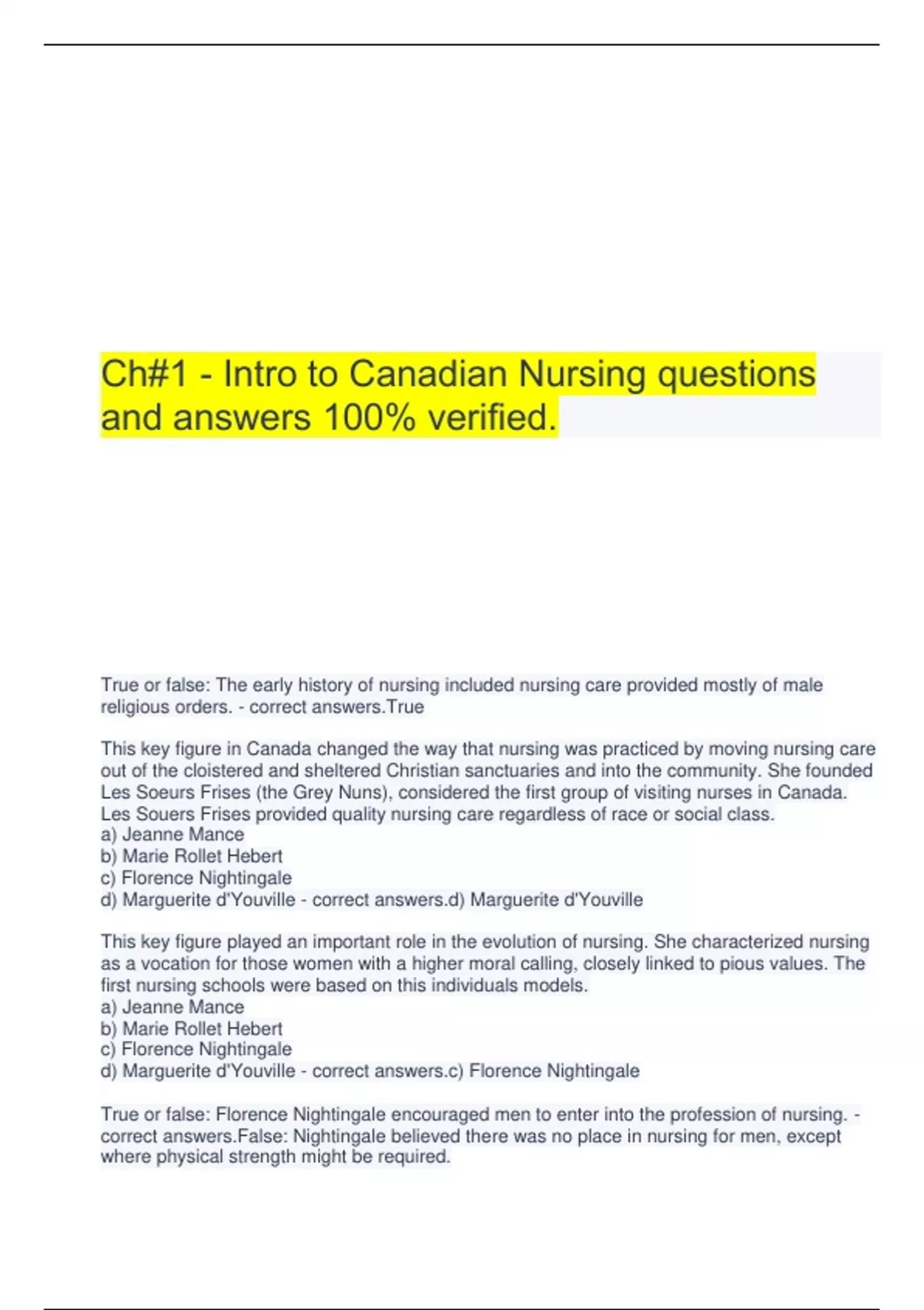 Ch#1 - Intro to Canadian Nursing questions and answers 100% verified. True or false: The early history of nursing included nursing care provided mostly of male religious orders. - correct answers.True This key figure in Canada changed the way that nursing was practiced by moving nursing care out of the cloistered and sheltered Christian sanctuaries and into the community. She founded Les Soeurs Frises (the Grey Nuns), considered the first group of visiting nurses in Canada. Les Souers Frises provided quality nursing care regardless of race or social class. a) Jeanne Mance b) Marie Rollet Hebert c) Florence Nightingale d) Marguerite d'Youville - correct answers.d) Marguerite d'Youville This key figure played an important role in the evolution of nursing. She characterized nursing as a vocation for those women with a higher moral calling, closely linked to pious values. The first nursing schools were based on this individuals models. a) Jeanne Mance b) Marie Rollet Hebert c) Florence Nightingale d) Marguerite d'Youville - correct answers.c) Florence Nightingale True or false: Florence Nightingale encouraged men to enter into the profession of nursing. - correct answers.False: Nightingale believed there was no place in nursing for men, except where physical strength might be required.