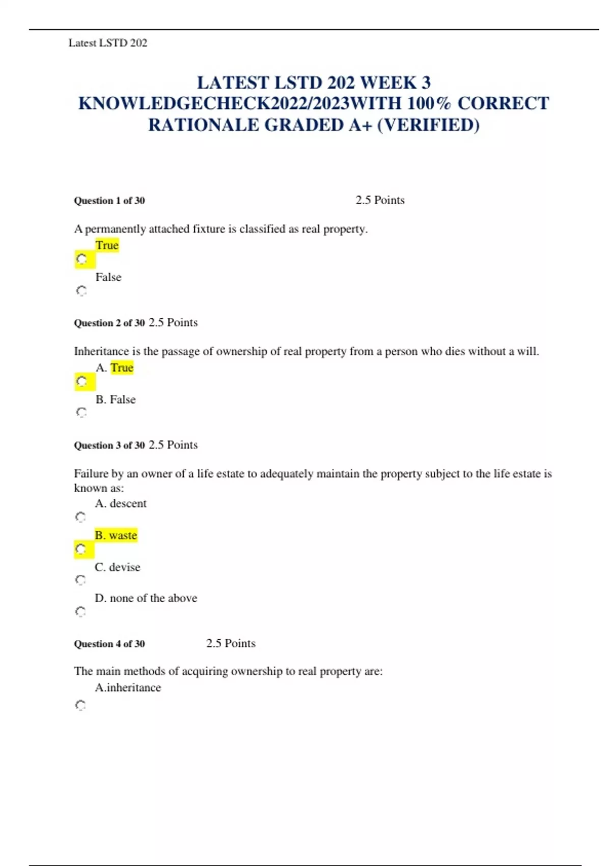 LATEST LSTD 202 WEEK 3 KNOWLEDGECHECK2022/2023WITH 100% CORRECT RATIONALE GRADED A+ (VERIFIED) Question 1 of 30 2.5 Points A permanently attached fixture is classified as real property. True False Question 2 of 30 2.5 Points Inheritance is the passage of ownership of real property from a person who dies without a will. A. True B. False Question 3 of 30 2.5 Points Failure by an owner of a life estate to adequately maintain the property subject to the life estate is known as: A. descent B. waste C. devise