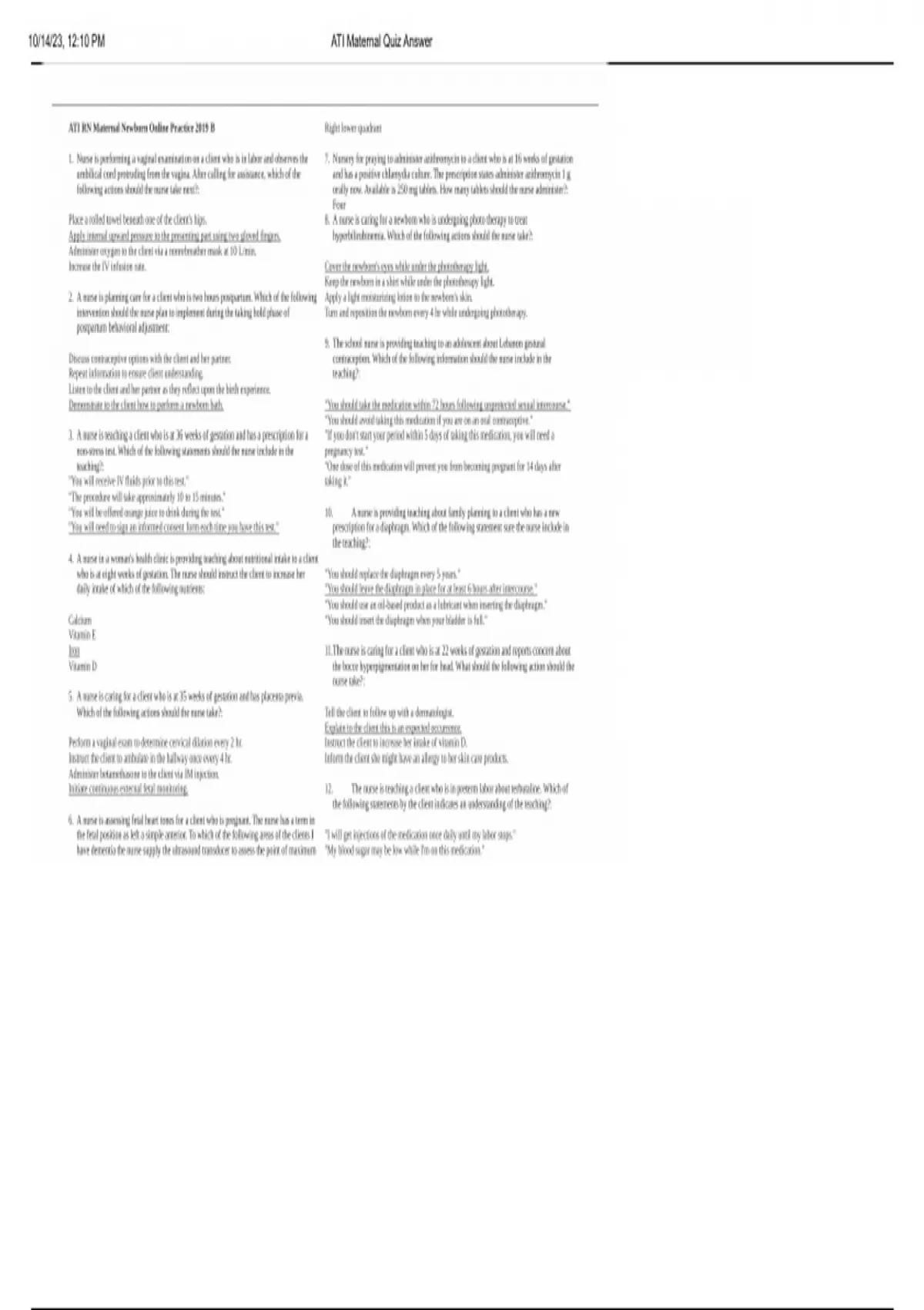 , 10/14/23, 12:10 PM ATI Maternal Quiz Answer