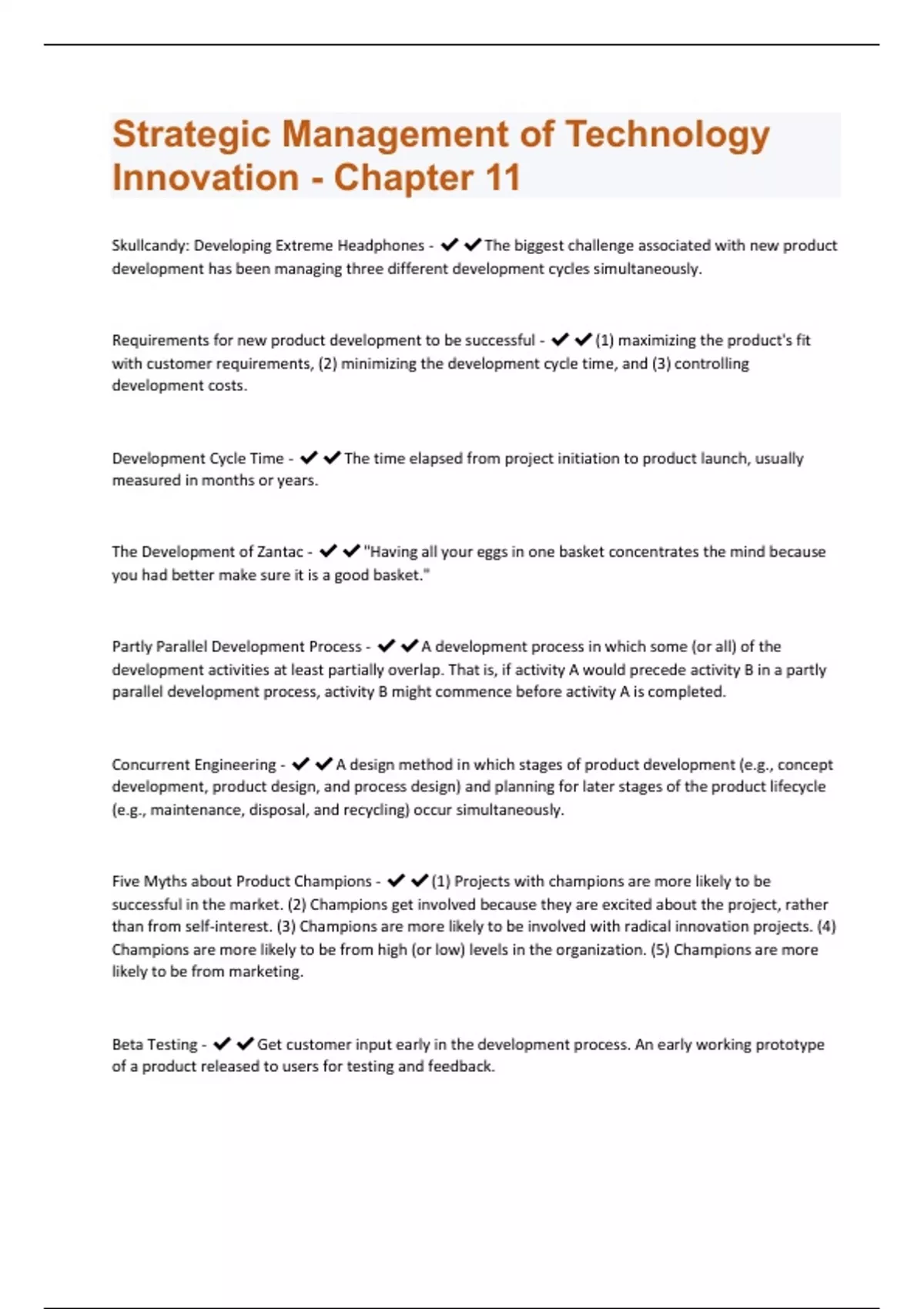 Skullcandy: Developing Extreme Headphones - The biggest challenge associated with new product development has been managing three different development cycles simultaneously. Requirements for new product development to be successful - (1) maximizing the product's fit with customer requirements, (2) minimizing the development cycle time, and (3) controlling development costs. Development Cycle Time - The time elapsed from project initiation to product launch, usually measured in months or years. The Development of Zantac - "Having all your eggs in one basket concentrates the mind because you had better make sure it is a good basket." Partly Parallel Development Process - A development process in which some (or all) of the development activities at least partially overlap. That is, if activity A would precede activity B in a partly parallel development process, activity B might commence before activity A is completed. Concurrent Engineering - A design method in which stages of product development (e.g., concept development, product design, and process design) and planning for later stages of the product lifecycle (e.g., maintenance, disposal, and recycling) occur simultaneously. Five Myths about Product Champions - (1) Projects with champions are more likely to be successful in the market. (2) Champions get involved because they are excited about the project, rather than from self-interest. (3) Champions are more likely to be involved with radical innovation projects. (4) Champions are more likely to be from high (or low) levels in the organization. (5) Champions are more likely to be from marketing. Beta Testing - Get customer input early in the development process. An early working prototype of a product released to users for testing and feedback.Lead Users - Customers who face the same general needs of the marketplace but are likely to experience them months or years earlier than the rest of the market and stand to benefit disproportionately from solutions to those needs.