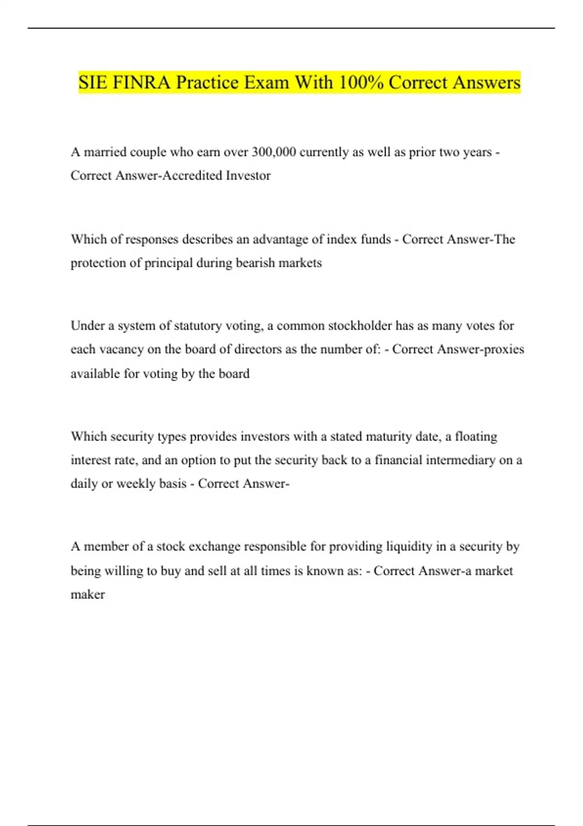A married couple who earn over 300,000 currently as well as prior two years - Correct Answer-Accredited Investor Which of responses describes an advantage of index funds - Correct Answer-The protection of principal during bearish markets Under a system of statutory voting, a common stockholder has as many votes for each vacancy on the board of directors as the number of: - Correct Answer-proxies available for voting by the board Which security types provides investors with a stated maturity date, a floating interest rate, and an option to put the security back to a financial intermediary on a daily or weekly basis - Correct Answer- A member of a stock exchange responsible for providing liquidity in a security by being willing to buy and sell at all times is known as: - Correct Answer-a market maker An associated person who is not a registered representative is permitted to engage in which of the following activities - Correct Answer-Provide account opening forms to a new customer Under FINRA rules, non-cash compensation connected with the sale of variable contracts includes all of the following items except: - Correct Answer-commissions FinCEN accomplishes its mission to safeguard the financial system from the abuses of financial crime, including terrorist financing and money laundering, by enforcing: - Correct Answer-the Bank Secrecy Act