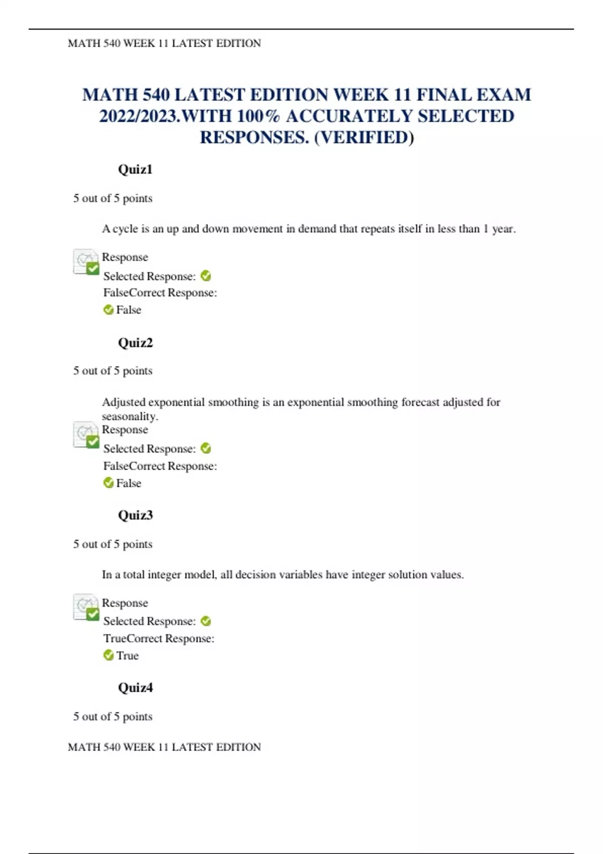 MATH 540 LATEST EDITION WEEK 11 FINAL EXAM 2022/2023.WITH 100% ACCURATELY SELECTED RESPONSES. (VERIFIED) Quiz1 5 out of 5 points A cycle is an up and down movement in demand that repeats itself in less than 1 year. Response Selected Response: False Correct Response: False Quiz2 5 out of 5 points Adjusted exponential smoothing is an exponential smoothing forecast adjusted for seasonality. Response Selected Response: False Correct Response: False Quiz3 5 out of 5 points In a total integer model, all decision variables have integer solution values. Response Selected Response: True Correct Response: True Quiz4 5 out of 5 points Fractional relationships between variables are not permitted in the standard form of a linear program. Response Selected Response: True Correct Response: True Quiz5 5 out of 5 points Excel can be used to simulate systems that can be represented by both discrete and continuous random variables. Response Selected Response: True Correct Response: True Quiz6