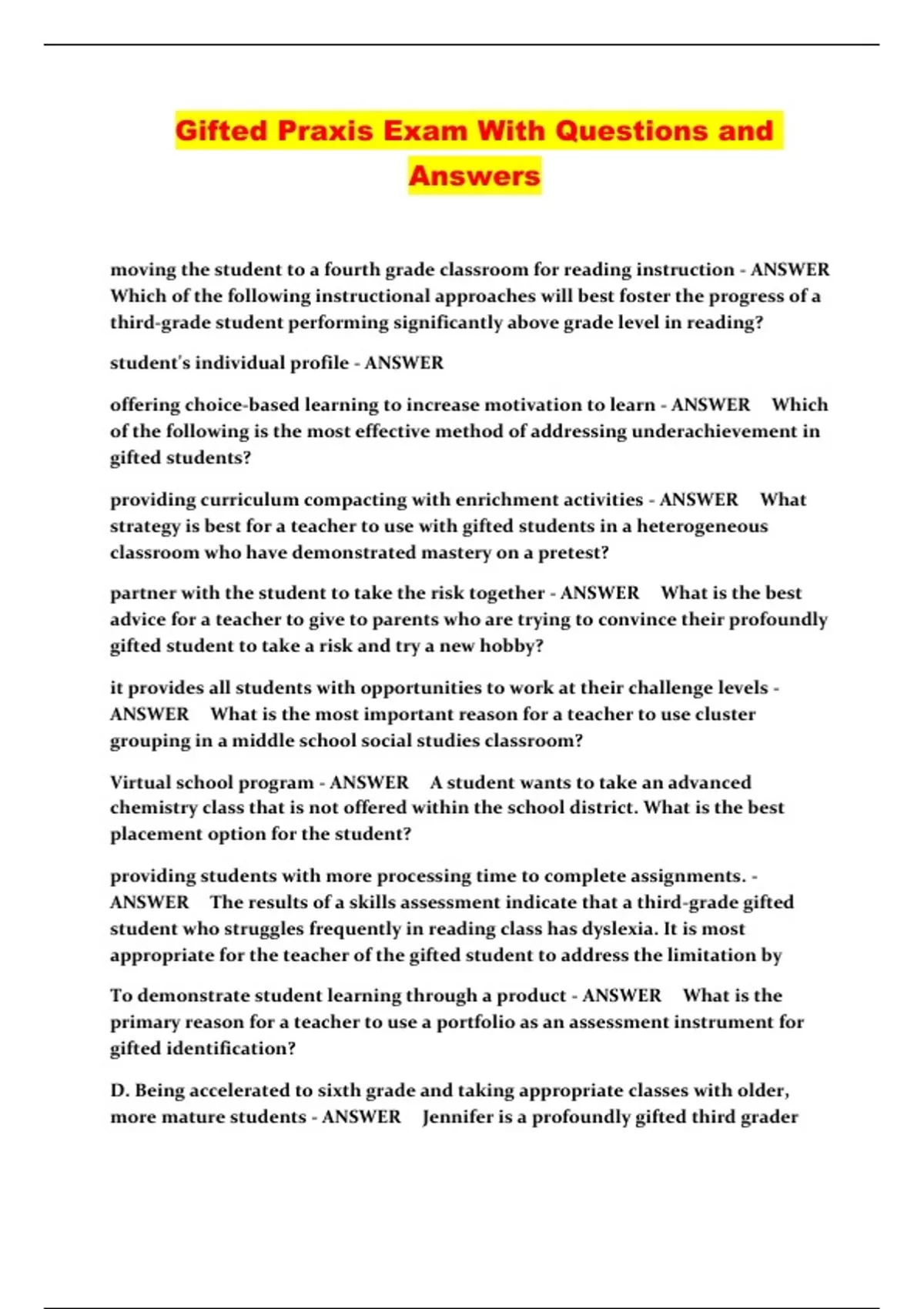 Gifted Praxis Exam With Questions and Answers