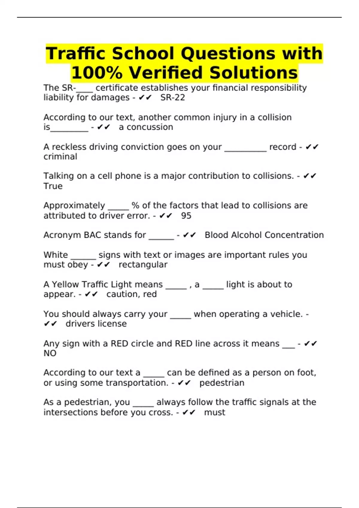 Traffic School Questions with 100% Verified Solutions