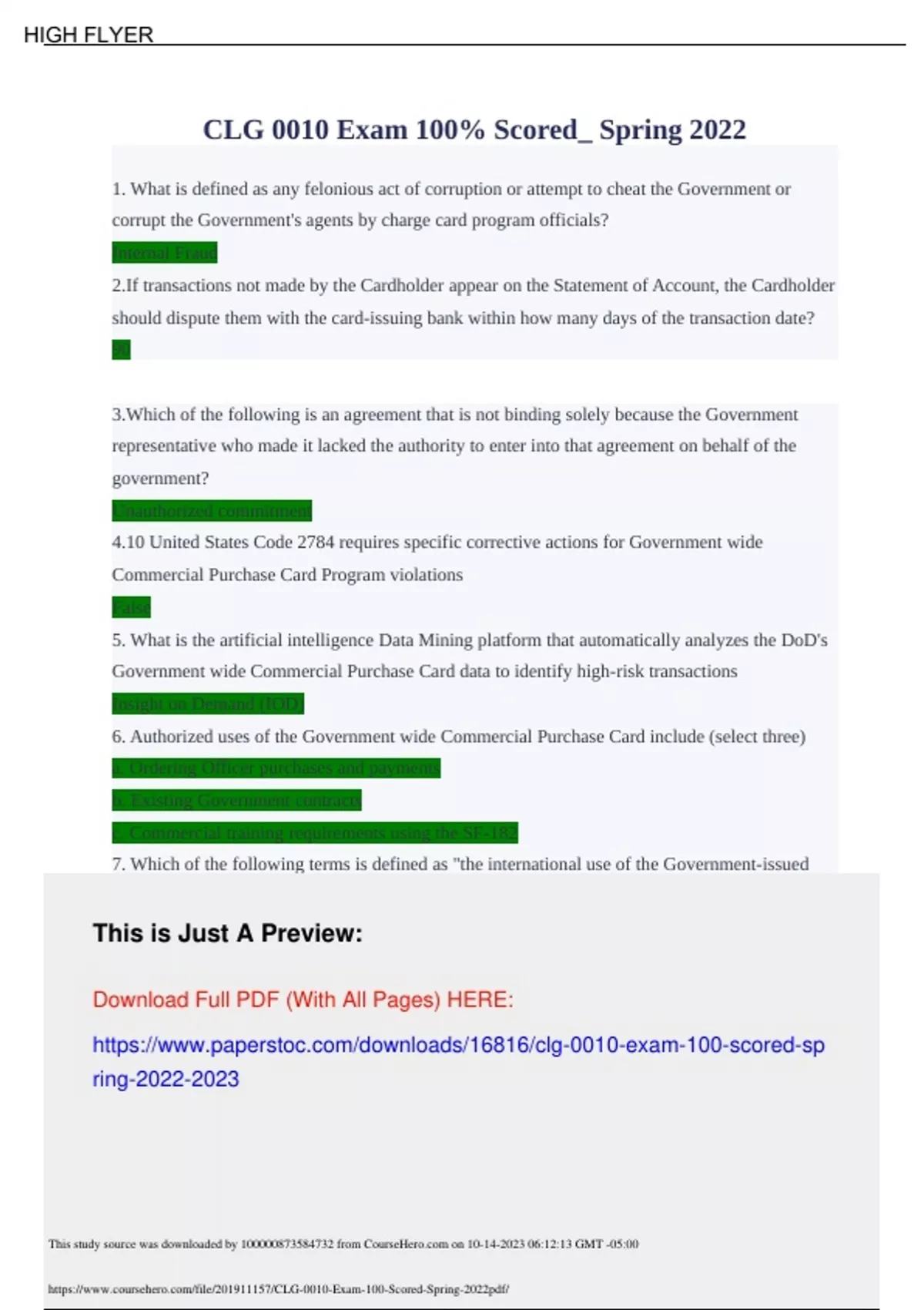 CLG 0010 Exam 100% Scored_ Spring 2022 1. What is defined as any felonious act of corruption or attempt to cheat the Government or corrupt the Government's agents by charge card program officials? Internal Fraud 2.If transactions not made by the Cardholder appear on the Statement of Account, the Cardholder should dispute them with the card-issuing bank within how many days of the transaction date? 90 3.Which of the following is an agreement that is not binding solely because the Government representative who made it lacked the authority to enter into that agreement on behalf of the government? Unauthorized commitment 4.10 United States Code 2784 requires specific corrective actions for Government wide Commercial Purchase Card Program violations False 5. What is the artificial intelligence Data Mining platform that automatically analyzes the DoD's Government wide Commercial Purchase Card data to identify high-risk transactions Insight on Demand (IOD) 6. Authorized uses of the Government wide Commercial Purchase Card include (select three) a. Ordering Officer purchases and payments b. Existing Government contracts c. Commercial training requirements using the SF-182 7. Which of the following terms is defined as "the international use of the Government-issued charge card in violation of applicable regulations"? Abuse 8. How many Cardholder accounts may be rolled up under a Managing Account? Seven 9. You receive a request to purchase construction services. After obtaining all necessary approvals, you call the construction company, which advises you that the cost for its services will total $2,400. You agree to make the purchase, and the construction company accepts your This study source was downloaded by from CourseH on :07:14 GMT -06:00 This is Just A Preview: Download Full PDF (With All Pages) HERE: ring- This study source was downloaded by from CourseH on :12:13 GMT -05:00 HIGH FLYER Governmentwide Commercial Purchase Card as the method of purchase. What did you do wrong? You made a purchase for construction with the Governmentwide Commercial Purchase Card that exceeded $2,000 10. Because they are a potential indicator of misuse, abuse, or fraud, delinquent accounts are subject to what? Increased scrutiny 11. What must the Cardholder do to become qualified to make Governmentwide Commercial Purchase Card purchases up to $25,000 outside of the United States and its jurisdictions? The Cardholder must receive customized training 12. Which of the following is a Cardholder responsibility in the Governmentwide Commercial Purchase Card Program? Reconcile the monthly Statement of Account 13. Which of the following is an appropriate circumstance for using a convenience check? A merchant does not accept payment by credit card 14. How long does Foreign Military Sales documentation have to be retained following case closure? 10 years 15. In order to use the Governmentwide Commercial Purchase Card for simplified acquisitions up to $25,000 outside the United States and its jurisdictions, the Cardholder, merchant, and supply delivery/service execution must all be outside the United States and its jurisdictions. True 16. Cardholders may be granted authority to use their Governmentwide Commercial Purchase Card accounts to make payments against contracts.