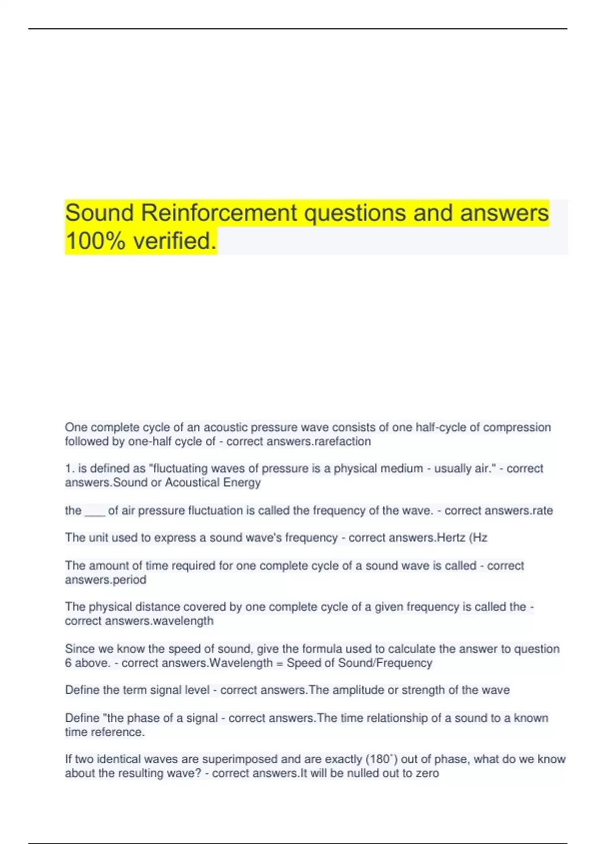 Sound Reinforcement questions and answers 100% verified. One complete cycle of an acoustic pressure wave consists of one half-cycle of compression followed by one-half cycle of - correct action 1. is defined as "fluctuating waves of pressure is a physical medium - usually air." - correct answers.Sound or Acoustical Energy the ___ of air pressure fluctuation is called the frequency of the wave. - correct The unit used to express a sound wave's frequency - correct answers.Hertz (Hz The amount of time required for one complete cycle of a sound wave is called - correct d The physical distance covered by one complete cycle of a given frequency is called the - correct ength Since we know the speed of sound, give the formula used to calculate the answer to question 6 above. - correct answers.Wavelength = Speed of Sound/Frequency Define the term signal level - correct answers.The amplitude or strength of the wave Define "the phase of a signal - correct answers.The time relationship of a sound to a known time reference. If two identical waves are superimposed and are exactly (180˚) out of phase, what do we know about the resulting wave? - correct answers.It will be nulled out to zero With regards to audio systems, what is the purpose of an input transducer? - correct answers.To convert acoustical energy into electrical energy Give three examples of an input transducer - correct answers.Mics, Contact Pickups, Magnetic Pickups, Tape Heads, Phono Cartridge, Laser Pickup, Optical Pickup The purpose of an RIAA pre-amplifier is? - correct answers.Provide the necessary EQ correction so a turntable can be run into a mixer Which would typically require a larger mixing console, a sound reinforcement situation or a sound reproduction situation? - correct answers.Sound Reinforcement Give three examples of an output transducers used in audio systems - correct answers.Woofers, Midrange Speakers, Tweeters, Full-range Speakers, Subwoofers, Supertweeters, Monitor Speakers, Headphones. I am running 0.2 Amps (200 mA) through an 8 Ohm speaker. What is my voltage through the speaker? - correct answers.E = R • I so 1.6 Volts Using the same information from question 16, what is my power at the speaker? (I am running 0.2 Amps (200 mA) through an 8 Ohm speaker. What is my voltage through the speaker? ) - correct answers.P = I • E so 0.32 Watts (320 mW) Resistance is measured in ohms. What is the symbol used for ohms - correct answers.Ω Define the term "Frequency Response" - correct answers.The relationship between a device's input and output with regard to signal frequency and amplitude. The frequency ratio between any two musical tones one octave apart is - correct answers.2:1 Define the term "presence peak." - correct answers.A broad peak (3 to 6 dB) in a microphone's frequency response centered in the region of 2 kHz and 5 kHz. It has the effect of adding crispness and intelligibility to words. What would be the typical useful frequency range of a subwoofer? - correct answers.< 300Hz (typically <100 Hz) down to about 30Hz When it comes to speech, would it be acceptable to amplify it though a sound system with a frequency response of 300Hz to 1 kHz? Why or why not? - correct answers.Most of the consonants are above 1kHz so the voice through this sound system would be hard to understand. The highest fundamental frequency (pitch) produced by acoustic instruments (including the piano) - correct ximately 4 kHz The musical term "timbre" is how we describe the number and amplitude of a note's - correct nics, partials, overtones. What sort of connector is found on an industry standard mic cable? - correct answers.3 pin XLR