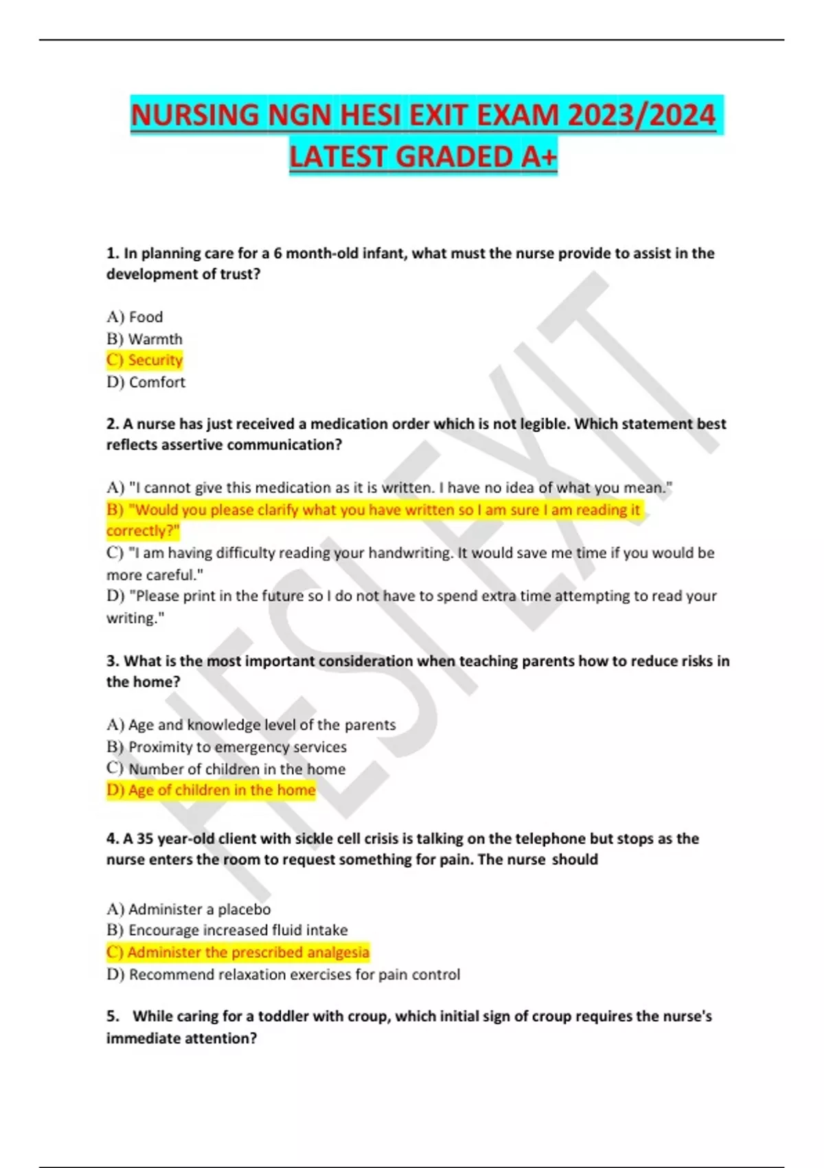 NURSING NGN HESI EXIT EXAM 2023/2024 LATEST GRADED A+ 1.In planning care for a 6 month-old infant, what must the nurse provide to assist in the development of trust? A)Food B)Warmth C)Security D)Comfort 2.A nurse has just received a medication order which is not legible. Which statement best reflects assertive communication? A)"I cannot give this medication as it is written. I have no idea of what you mean." B)"Would you please clarify what you have written so I am sure I am reading it correctly?" C)"I am having difficulty reading your handwriting. It would save me time if you would be more careful." D)"Please print in the future so I do not have to spend extra time attempting to read your writing." 3.What is the most important consideration when teaching parents how to reduce risks in the home? A)Age and knowledge level of the parents B)Proximity to emergency services C)Number of children in the home D)Age of children in the home 4.A 35 year-old client with sickle cell crisis is talking on the telephone but stops as the nurse enters the room to request something for pain. The nurse should A)Administer a placebo B)Encourage increased fluid intake C)Administer the prescribed analgesia D)Recommend relaxation exercises for pain control 5.While caring for a toddler with croup, which initial sign of croup requires the nurse's immediate attention? A)Respiratory rate of 42 B)Lethargy for the past hour C)Apical pulse of 54 D)Coughing up copious secretions 6.A client is admitted with low T3 and T4 levels and an elevated TSH level. On initial assessment, the nurse would anticipate which of the following assessment findings? A)Lethargy B)Heat intolerance C)Diarrhea D)Skin eruptions 7.The emergency room nurse admits a child who experienced a seizure at school. The father comments that this is the first occurrence, and denies any family history of epilepsy. What is the best response by the nurse? A)"Do not worry. Epilepsy can be treated with medications." B)"The seizure may or may not mean your child has epilepsy." C)"Since this was the first convulsion, it may not happen again." D)"Long term treatment will prevent future seizures." 8.Alcohol and drug abuse impairs judgment and increases risk taking behavior. What nursing diagnosis best applies? A)Risk for injury B)Risk for knowledge deficit C)Altered thought process D)Disturbance in self-esteem 9. Which these findings would the nurse more closely associate with anemia in a 10 month-old infant? A) Hemoglobin level of 12 g/dI B) Pale mucosa of the eyelids and lips C) Hypoactivity D) A heart rate between 140 to 160 10. The nurse is caring for a client in hypertensive crisis in an intensive care unit. The priority assessment in the first hour of care is A) Heart rate B) Pedal pulses C) Lung sounds D) Pupil responses