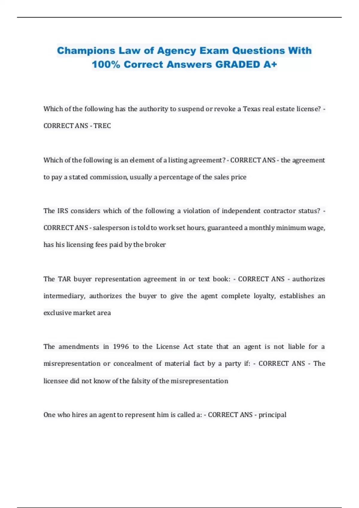 Champions Law of Agency Exam Questions With 100% Correct Answers GRADED A+