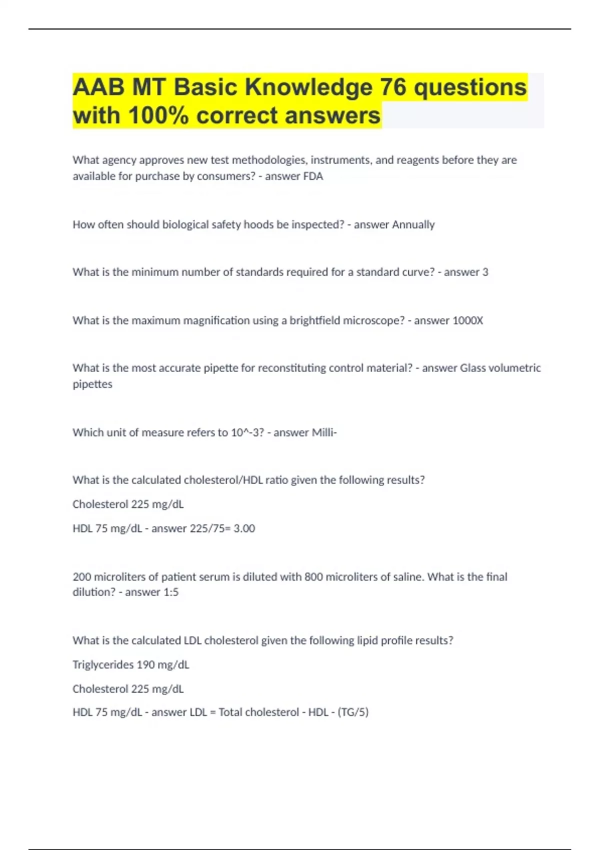 What agency approves new test methodologies, instruments, and reagents before they are available for purchase by consumers? FDA How often should biological safety hoods be inspected? Annually What is the minimum number of standards required for a standard curve? 3 What is the maximum magnification using a brightfield microscope? 1000X What is the most accurate pipette for reconstituting control material? Glass volumetric pipettes Which unit of measure refers to 10^-3? Milli- What is the calculated cholesterol/HDL ratio given the following results? Cholesterol 225 mg/dL HDL 75 mg/dL 225/75= 3.00 200 microliters of patient serum is diluted with 800 microliters of saline. What is the final dilution? 1:5 What is the calculated LDL cholesterol given the following lipid profile results? Triglycerides 190 mg/dL Cholesterol 225 mg/dL HDL 75 mg/dL LDL = Total cholesterol - HDL - (TG/5) 112 = 225 - 75 - (190/5) How is relative centrifugal force calculated? 1.18 x 10^-5 x r x rpm^2 A chain of custody is required for all of the following: Legal blood alcohol, pre-employment drug screen, and paternity testing A chain of custody is required for all of the following, EXCEPT: Fetal fibronectin What federal legislation regulates most clinical laboratories? Clinical Laboratory Improvement Amendments (CLIA) What is the level of complexity of most testing performed in clinical laboratories? Moderately complex How often does CLIA require clinical laboratories to have inspections? Every 2 years Which laboratories are NOT required to participate in proficiency testing? Laboratories performing waived testing only. Which proficiency testing (PT) results do not meet the CLIA performance criteria? Failed the same analyte in two consecutive PT events Which one of the following is an example of alternate proficiency testing? Split samples sent to another facility using the same test method. All of the following are pre-analytical errors except which one? Transcription error entering a manual result All of the following are pre-analytical erros: Ordering a lab test under the wrong patient number, misidentification of a patient, mislabeling an add-on test Which one of the following is the most common analytical error? Not checking specimen integrity What is the most common post-analytical error? Clerical errors How often must a procedure be reviewed? Annual review is required How often must thermometers be checked against the NIST thermometer? Annually In which manual are the directions for running quality control for a specific assay kept? Operating procedure manual Following equipment maintenance, when is quality control suggested? After any preventative maintenance What is the most common reason for a control value to be outside of 3SD? Random error If one control is outside the 95% confidence limits, then what is the most appropriate remedial action to take initially? Repeat the same control Where should an unopened container of methanol be stored? Flammable safety cabinet After preventative maintenance by field service, which one of the following is recommended? Verification of QC results According to CLIA, who is responsible for specimen processing, test performance, and reporting test results? Testing personnel Which one of the following is NOT a job duty of the testing personnel? Interpretation of highly complex testing All of the following are job duties of testing personnel: Inventory control, equipment maintenance, and accuracy of reported results Which one of the following is not required to be kept in the employee's personnel records? Continuing education documents? All of the following are required to be kept in the employee's personnel records: Job competency training checklist, remedial action documentation, and annual performance appraisal. Which one of the following statements concerning CEUs is false? CEUs are mandated by the College of American Pathologists Who is responsible for monitoring trends for corrected reports in the laboratory? Quality assurance Which federal law requires that the competency of laboratory personnel be documented? CLIA Tracking and trending customer complaints concerning the laboratory is a responsibility of which area? Quality assurance Which federal agency issues regulations to ensure employee safety? Occupational Safety and Health Administration (OSHA) OSHA Hazard Communication Standard requires original container labels to contain all of the following information EXCEPT which one? Emergency telephone number OSHA Hazard Communication Standard requires original container labels to contain all of the following information: Product name, warning label, and manufacturer's name and address Which federal agency requires safety training during new employee orientation and annually thereafter? OSHA