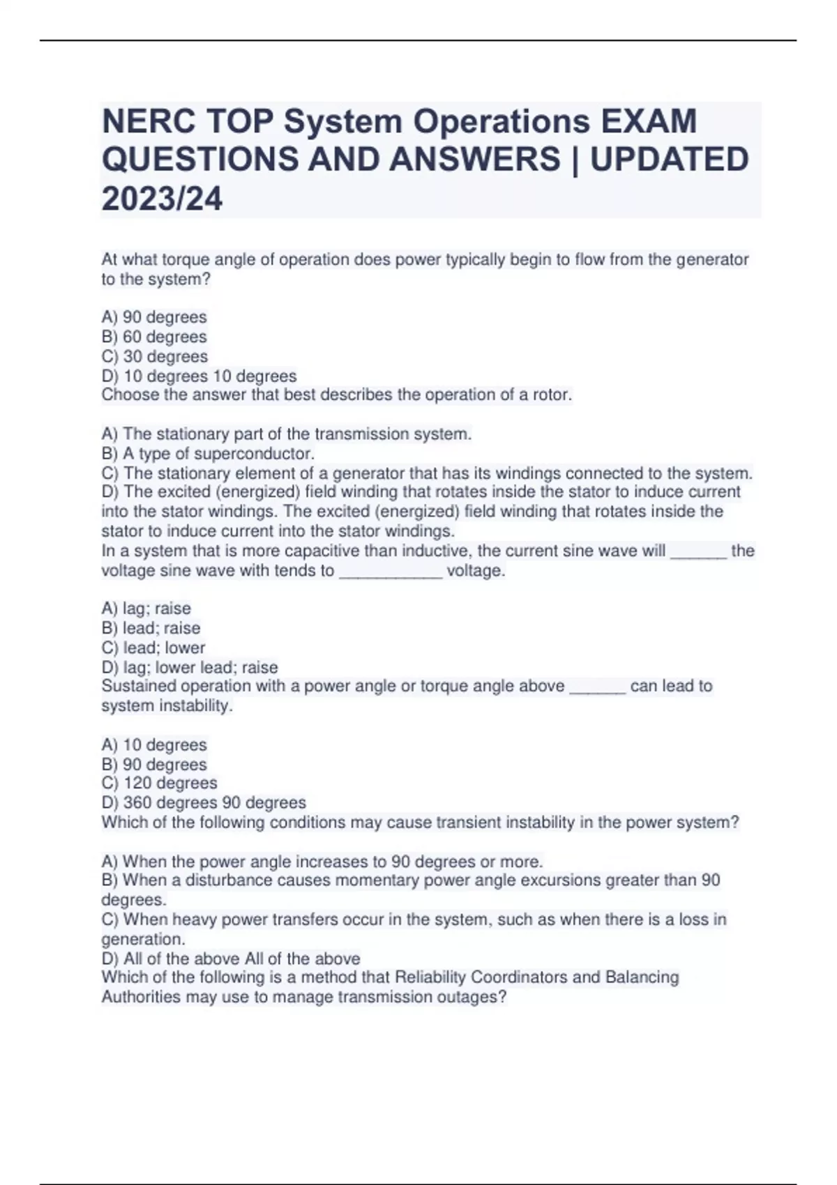 NERC TOP System Operations EXAM QUESTIONS AND ANSWERS | UPDATED 2023/24 At what torque angle of operation does power typically begin to flow from the generator to the system? A) 90 degrees B) 60 degrees C) 30 degrees D) 10 degrees 10 degrees Choose the answer that best describes the operation of a rotor. A) The stationary part of the transmission system. B) A type of superconductor. C) The stationary element of a generator that has its windings connected to the system. D) The excited (energized) field winding that rotates inside the stator to induce current into the stator windings. The excited (energized) field winding that rotates inside the stator to induce current into the stator windings. In a system that is more capacitive than inductive, the current sine wave will ______ the voltage sine wave with tends to ___________ voltage. A) lag; raise B) lead; raise C) lead; lower D) lag; lower lead; raise Sustained operation with a power angle or torque angle above ______ can lead to system instability. A) 10 degrees B) 90 degrees C) 120 degrees D) 360 degrees 90 degrees Which of the following conditions may cause transient instability in the power system? A) When the power angle increases to 90 degrees or more. B) When a disturbance causes momentary power angle excursions greater than 90 degrees. C) When heavy power transfers occur in the system, such as when there is a loss in generation. D) All of the above All of the above Which of the following is a method that Reliability Coordinators and Balancing Authorities may use to manage transmission outages? A) Coordinate and adhere to voltage schedules to minimize reactive power flow. B) Optimize the use of Load Tap Changer transformers, capacitors, and reactors. C) Verify voltage control equipment are on automatic to supply the required voltage support. D) All of the above All of the above When a large generator on an Interconnection trips off line, the ____________ of the Interconnection ____________. A) frequency; drops B) transformer temperature; drops C) AVRs; drops D) voltage; increases frequency; drops A(n) ___________ is the value that satisfies the most limiting of the prescribed operating criteria for a specified system configuration to ensure operation within acceptable reliability criteria. A) System Operating Limit B) Circuit Overload C) System Overload Limit D) Interconnection Reliability Operating Limits System Operating Limit Generator ratings specify the __________ and ___________ at which they can operate safely. A) temperature; voltage B) torque angle; voltage C) System Operating Limits; Interconnection Operating Limits D) voltage; frequency voltage; frequency Which of the following is one of the criteria used to determine the System Operating Limit? A) Setting appropriate voltage levels to withstand various contingencies. B) Identifying equipment minimum loading capabilities. C) Recognizing operator limitations. D) Identifying how transformers respond to severe fluctuations in frequency. Setting appropriate voltage levels to withstand various contingencies. NERC Standard CIP-001 is applicable to which of the following entities? A) Generator Operators and Load Serving Entities B) Balancing Authorities and Transmission Operators C) All of the choices provided D) Reliability Coordinators All of the choices provided Sabotage events are often difficult to identify, therefore, entities are required to have __________ available for operating personnel. A) procedures B) contact information C) FBI or RMCP D) displays procedures NERC requires each Reliability Coordinator, Balancing Authority, Transmission Operator, Generator Operator, and Load Serving Entity shall have procedures for the recognition of and for making _______________ aware of sabotage events on its facilities and multi-site sabotage affecting larger portions of the Interconnection. A) Regional Reliability Organizations B) DOE C) NERC D) their operating personnel their operating personnel NERC requires each Reliability Coordinator, Balancing Authority, Transmission Operator, Generator Operator and Load Serving Entity to establish communications contacts, as applicable with local Federal Bureau of Investigation (FBI) or Royal Canadian Mounted Police (RCMP) officials and develop _____________ as appropriate to their circumstances. A) media relations B) reporting procedures C) governmental operating guidelines D) step by step procedures to stop the sabatoge reporting procedures In the event of sabotage on the transmission or generation system, it is highly likely that the procedure developed for CIP-001 will include the Disturbance Reporting procedure your organization has developed in response to NERC Standard category ________. A) EOP B) TOP C) CIP D) IRO EOP Disturbance events that are suspected to be caused by sabotage, shall be reported to _____________. A) the appropriate systems B) governmental agencies C) regulatory bodies D) appropriate systems, governmental agencies and regulatory bodies appropriate systems, governmental agencies and regulatory bodies Of the following events, which is most LIKELY to be reported as sabotage? A) Guy wires are cut on transmission towers on two separate lines at about the same time. B) Several insulator strings on a span of transmission lines have been damaged by gunshots. C) On a transmission line with "H-frame" construction, one wood pole in a newly plowed field is cut nearly all the way through at the ground-line. D) A pole-top distribution transformer has lost most of its oil through a bullet hole. Guy wires are cut on transmission towers on two separate lines at about the same time. The one word that is used to distinguish the difference between vandalism and sabotage is ______________. A) premeditation B) results C) intent D) consequences intent On a mild spring day, a transmission line trips. The line then trips again when energized. Which of the following is LEAST likely to be the problem?