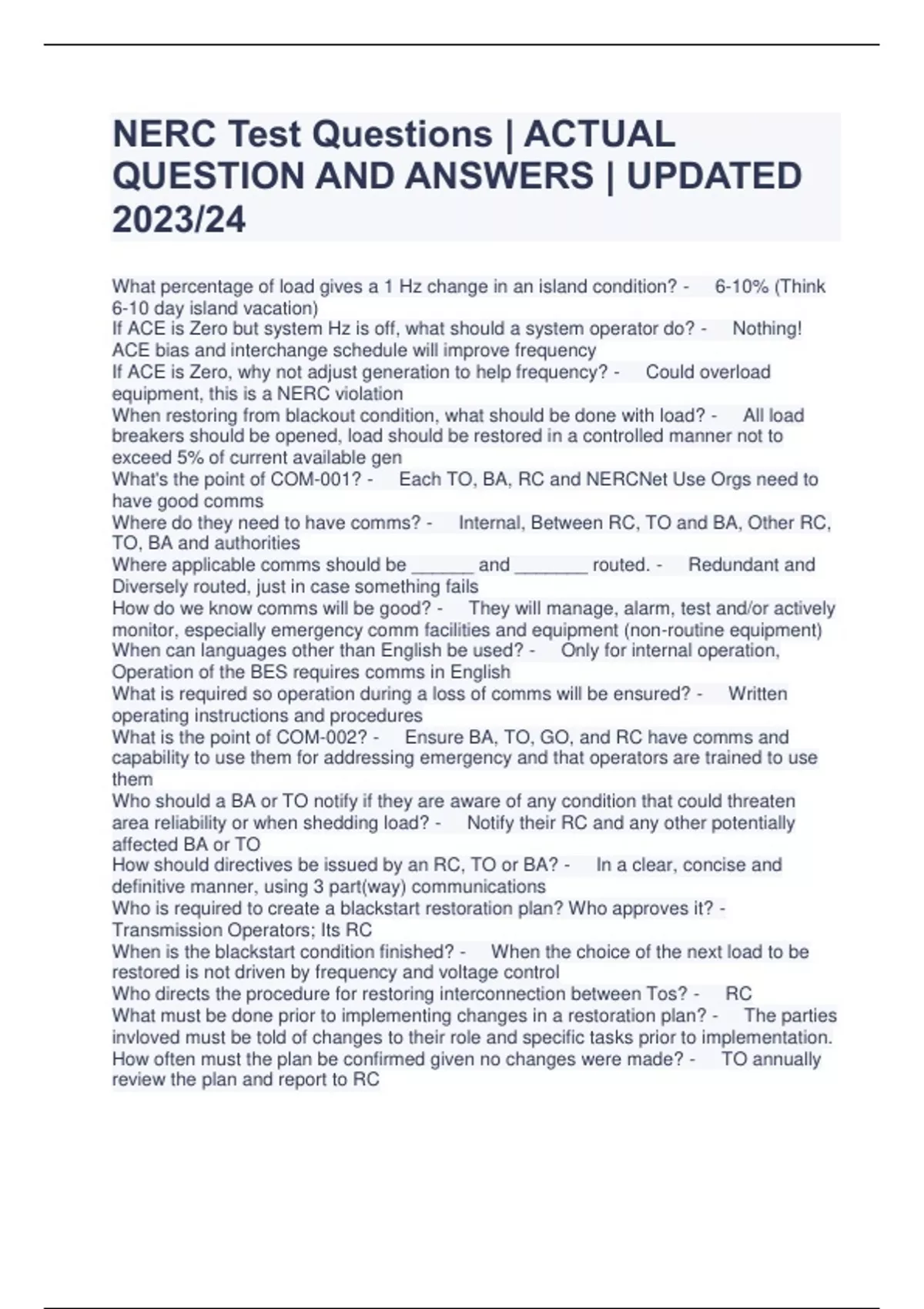 NERC Test Questions | ACTUAL QUESTION AND ANSWERS | UPDATED 2023/24