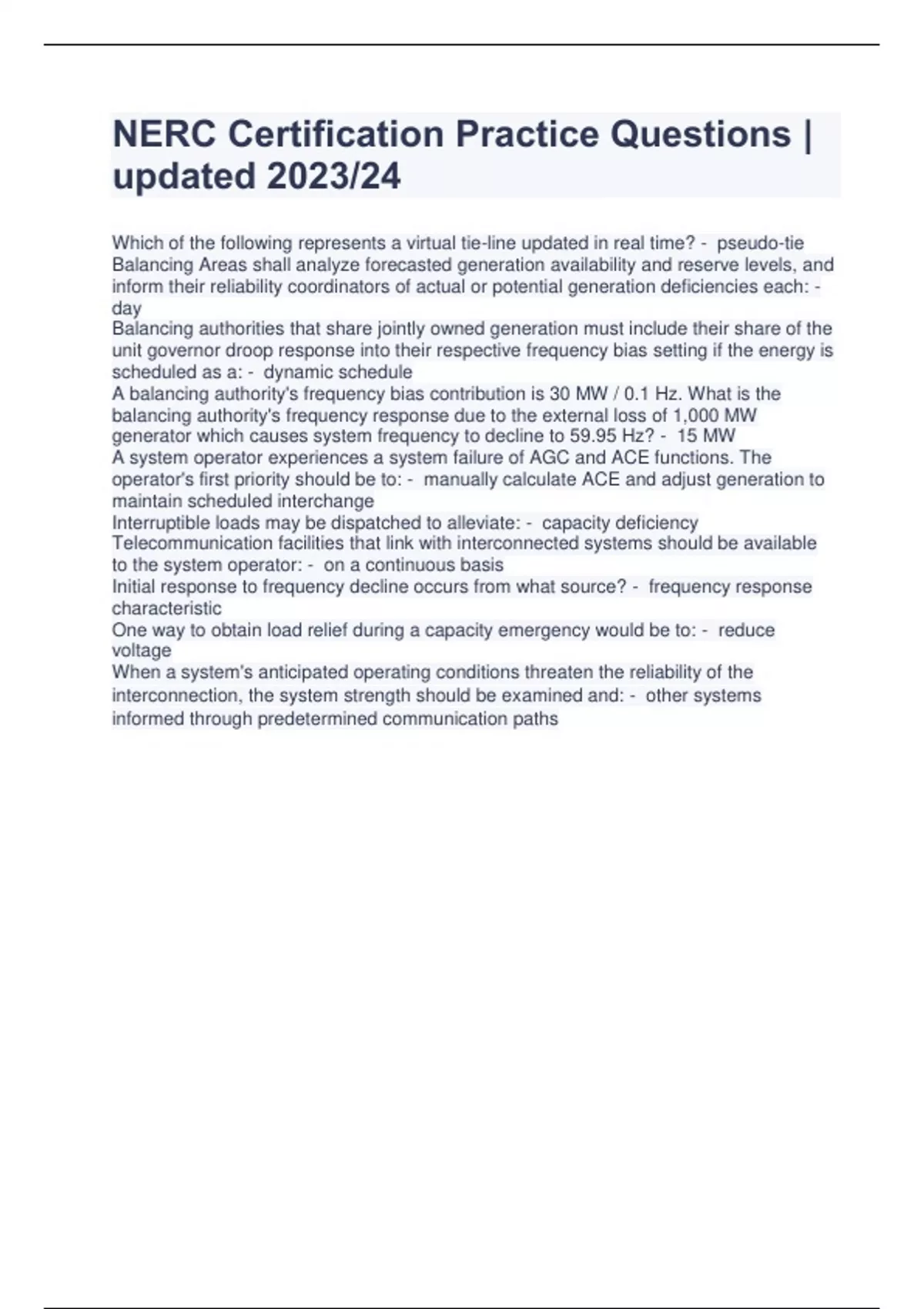 NERC Certification Practice Questions | updated 2023/24 Which of the following represents a virtual tie-line updated in real time? - pseudo-tie Balancing Areas shall analyze forecasted generation availability and reserve levels, and inform their reliability coordinators of actual or potential generation deficiencies each: - day Balancing authorities that share jointly owned generation must include their share of the unit governor droop response into their respective frequency bias setting if the energy is scheduled as a: - dynamic schedule A balancing authority's frequency bias contribution is 30 MW / 0.1 Hz. What is the balancing authority's frequency response due to the external loss of 1,000 MW generator which causes system frequency to decline to 59.95 Hz? - 15 MW A system operator experiences a system failure of AGC and ACE functions. The operator's first priority should be to: - manually calculate ACE and adjust generation to maintain scheduled interchange Interruptible loads may be dispatched to alleviate: - capacity deficiency Telecommunication facilities that link with interconnected systems should be available to the system operator: - on a continuous basis Initial response to frequency decline occurs from what source? - frequency response characteristic One way to obtain load relief during a capacity emergency would be to: - reduce voltage When a system's anticipated operating conditions threaten the reliability of the interconnection, the system strength should be examined and: - other systems