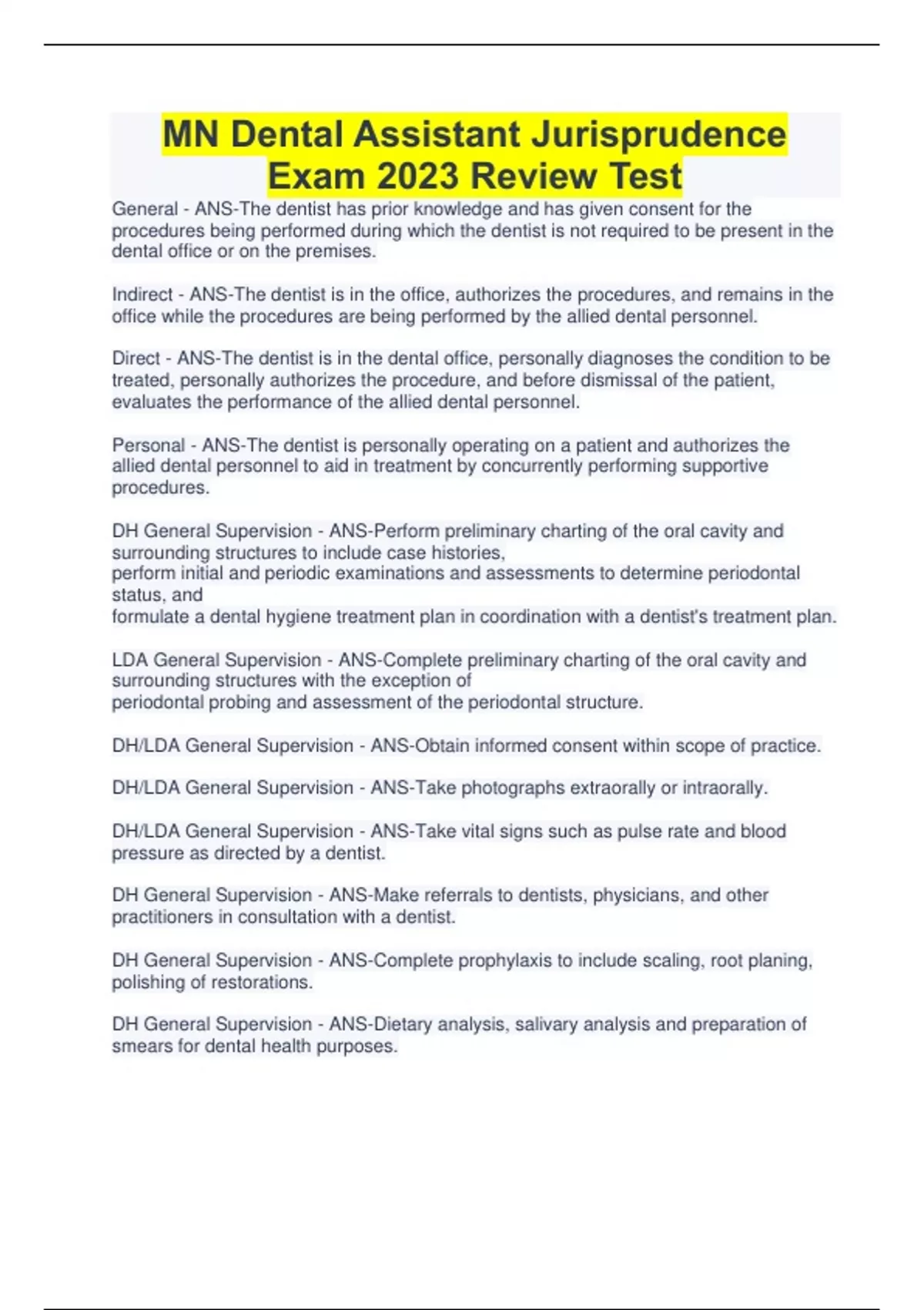 MN Dental Assistant Jurisprudence Exam 2023 Review Test General - ANS-The dentist has prior knowledge and has given consent for the procedures being performed during which the dentist is not required to be present in the dental office or on the premises. Indirect - ANS-The dentist is in the office, authorizes the procedures, and remains in the office while the procedures are being performed by the allied dental personnel. Direct - ANS-The dentist is in the dental office, personally diagnoses the condition to be treated, personally authorizes the procedure, and before dismissal of the patient, evaluates the performance of the allied dental personnel. Personal - ANS-The dentist is personally operating on a patient and authorizes the allied dental personnel to aid in treatment by concurrently performing supportive procedures. DH General Supervision - ANS-Perform preliminary charting of the oral cavity and surrounding structures to include case histories, perform initial and periodic examinations and assessments to determine periodontal status, and formulate a dental hygiene treatment plan in coordination with a dentist's treatment plan. LDA General Supervision - ANS-Complete preliminary charting of the oral cavity and surrounding structures with the exception of periodontal probing and assessment of the periodontal structure. DH/LDA General Supervision - ANS-Obtain informed consent within scope of practice. DH/LDA General Supervision - ANS-Take photographs extraorally or intraorally. DH/LDA General Supervision - ANS-Take vital signs such as pulse rate and blood pressure as directed by a dentist. DH General Supervision - ANS-Make referrals to dentists, physicians, and other practitioners in consultation with a dentist. DH General Supervision - ANS-Complete prophylaxis to include scaling, root planing, polishing of restorations. DH General Supervision - ANS- Continues...