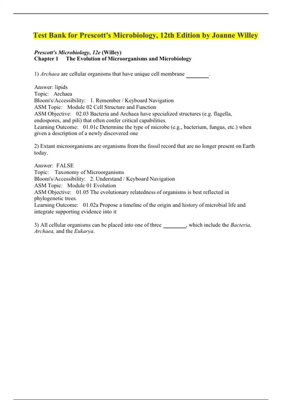 Test Bank for Prescott's Microbiology, 12th Edition by Joanne Willey