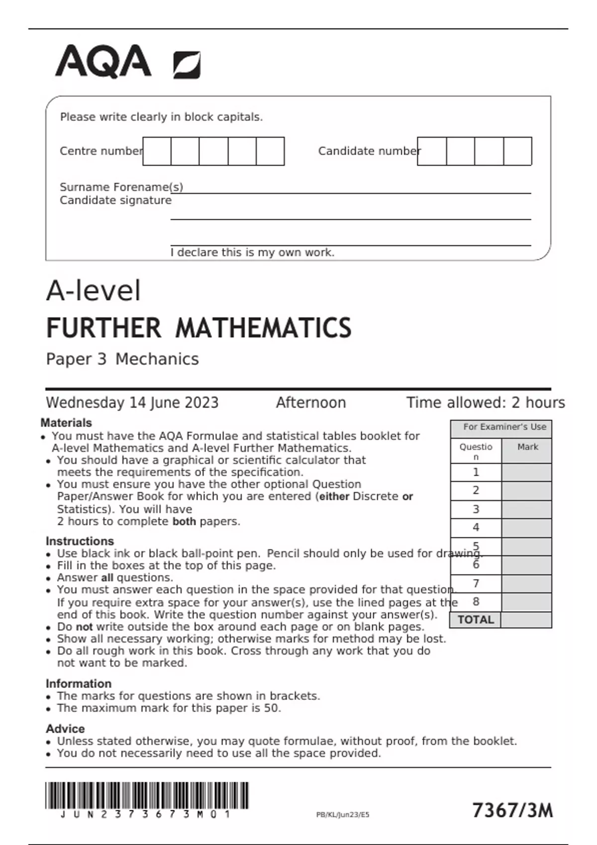 FURTHER MATHEMATICS Paper 3 Mechanics Wednesday 14 June 2023 Afternoon Time allowed: 2 hours Materials You must have the AQA Formulae and statistical tables booklet for A‑level Mathematics and A‑level Further Mathematics. You should have a graphical or scientific calculator that meets the requirements of the specification. You must ensure you have the other optional Question Paper/Answer Book for which you are entered (either Discrete or Statistics). You will have 2 hours to complete both papers. Instructions Use black ink or black ball‑point pen. Pencil should only be used for drawing. Fill in the boxes at the top of this page. Answer all questions. You must answer each question in the space provided for that question. If you require extra space for your answer(s), use the lined pages at the end of this book. Write the question number against your answer(s). Do not write outside the box around each page or on blank pages. Show all necessary working; otherwise marks for method may be lost. Do all rough work in this book. Cross through any work that you do not want to be marked. Information The marks for questions are shown in brackets. The maximum mark for this paper is 50. Advice Unless stated otherwise, you may quote formulae, without proof, from the booklet. You do not necessarily need to use all the space provided. PB/KL/Jun23/E5 7367/3M Answer all questions in the spaces provided. 1 State the dimensions of power. Circle your answer. ML2T —3 ML3T —3 ML3T —2 ML2T —2 [1 mark] box 2 The force (3i þ 4j) N acts at the point with coordinates (0, 2) The unit vectors i and j are directed along the x-axis and the y-axis respectively. Calculate the magnitude of the moment of this force about the origin. Circle your answer. [1 mark] 6Nm 8 Nm 10 Nm 14 N m 3 A uniform disc has mass 6 kg and diameter 8 cm A uniform rectangular lamina, ABCD, has mass 4 kg, width 8 cm and length 20 cm The disc is fixed to the lamina to form a composite body as shown in the diagram below. A B outside the box 8 cm D C 20 cm The sides AB, AD and CD are tangents to the disc. Calculate the distance of the centre of mass of the composite body from AD Circle your answer. [1 mark] 4 cm 5.6 cm 6.4 cm 8.8 cm 4 A car of mass 1400 kg drives around a horizontal circular bend of radius 60 metres. The car has a constant speed of 12 m s—1 on the bend. Calculate the magnitude of the resultant force acting on the car. [2 marks] Turn over 5 A region bounded by the curve with equation y 4 x2 shown below. , the x-axis and the y-axis is outside the box y O x The region is rotated through 360° around the x-axis to create a uniform solid. 5 (a) Show that the distance of the centre of mass of the solid from the circular face is 5 8 [5 marks] box 5 (b) The solid is suspended in equilibrium from a point on the edge of the circular face. Find the angle between the circular face and the horizontal, giving your answer to the nearest degree. [2 marks] Turn over 6 In this question use g ¼ 10 m s—2 A sphere of mass 0.8 kg is attached to one end of a string of length 2 metres. The other end of the string is attached to a fixed point O The sphere is released from rest with the string taut and at an angle of 30° to the vertical, as shown in the diagram below. box O 30° 6 (a) Find the speed of the sphere when it is directly below O [3 marks] 6 (b) State one assumption that you made about the string. [1 mark] 6 (c) As the sphere moves, the string makes an angle y with the downward vertical. By finding an expression for the tension in the string in terms of y, show that the tension is a maximum when the sphere is directly below O box [6 marks] 6 (d) A physics student conducts an experiment and uses a device to measure the tension in the string when the sphere is directly below O They find that the tension is 9.5 newtons. Explain why this result is reasonable, showing any calculations that you make. [2 marks] Turn over (07) 7 Two particles, A and B, are moving on a smooth horizontal surface. A straight line has been marked on the surface and the particles are on opposite sides of the line. Particle A has mass 2 kg and moves with velocity 4 m s—1 at an angle of 30° to the line. Particle B has mass 3 kg and moves with velocity 6 m s—1 at an angle of 45° to the line. The particles and their velocities are shown in the diagram below. A box 4 m s–1 30° 45° 6 m s–1 B The particles collide when they reach the line and then move together as a single combined particle. 7 (a) Show that the magnitude of the impulse on particle A during the collision is 7.55 N s correct to three significant figures. [8 marks]