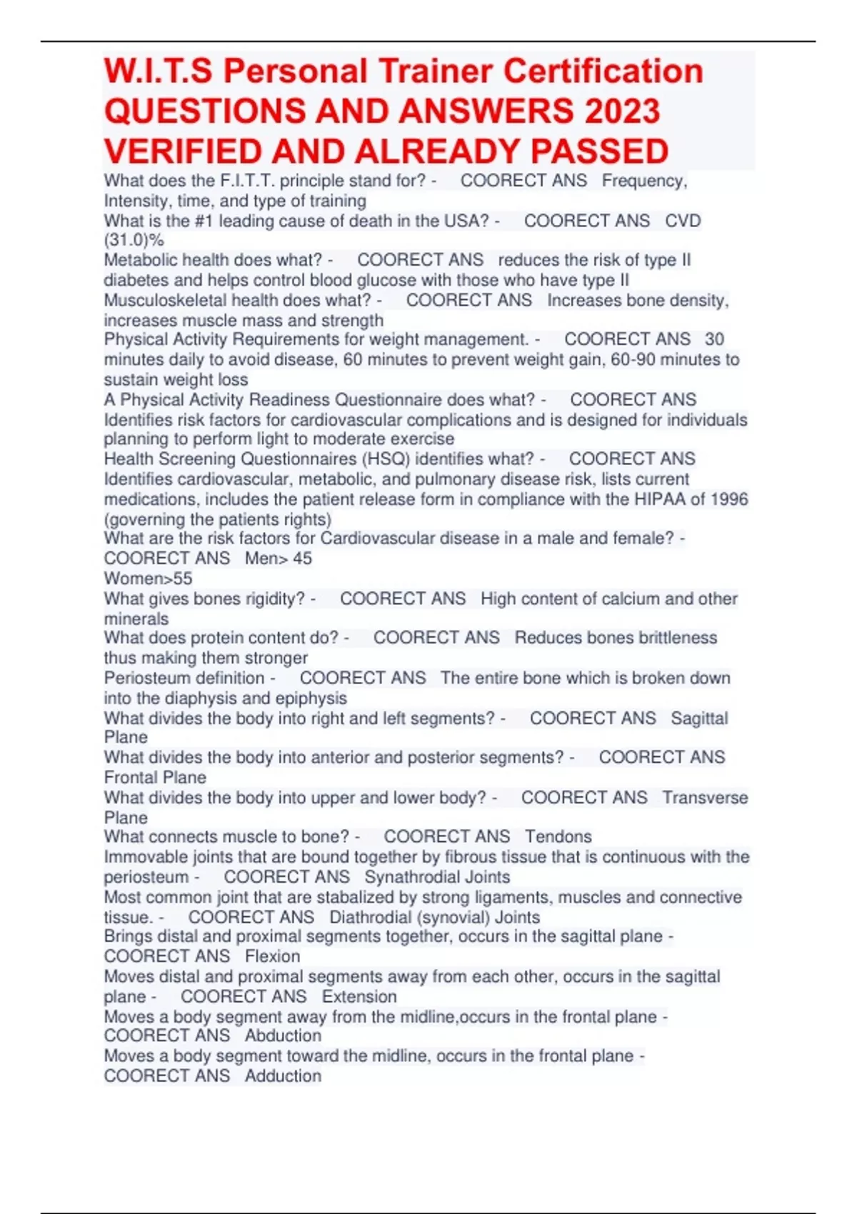 W.I.T.S Personal Trainer Certification QUESTIONS AND ANSWERS 2023 VERIFIED AND ALREADY PASSED