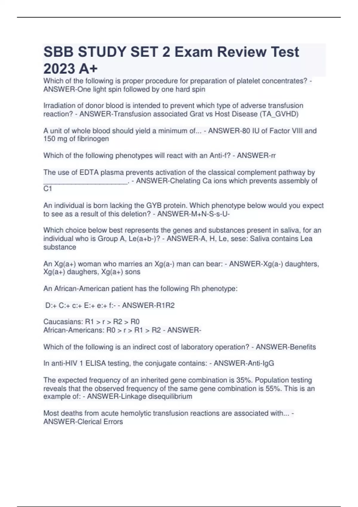 SBB STUDY SET 2 Exam Review Test 2023 A+ Which of the following is proper procedure for preparation of platelet concentrates? - ANSWER-One light spin followed by one hard spin Irradiation of donor blood is intended to prevent which type of adverse transfusion reaction? - ANSWER-Transfusion associated Grat vs Host Disease (TA_GVHD) A unit of whole blood should yield a minimum of... - ANSWER-80 IU of Factor VIII and 150 mg of fibrinogen Which of the following phenotypes will react with an Anti-f? - ANSWER-rr The use of EDTA plasma prevents activation of the classical complement pathway by _____________________. - ANSWER-Chelating Ca ions which prevents assembly of C1 An individual is born lacking the GYB protein. Which phenotype below would you expect to see as a result of this deletion? - ANSWER-M+N-S-s-UWhich choice below best represents the genes and substances present in saliva, for an individual who is Group A, Le(a+b-)? - ANSWER-A, H, Le, sese: Saliva contains Lea substance An Xg(a+) woman who marries an Xg(a-) man can bear: - ANSWER-Xg(a-) daughters, Xg(a+) daughers, Xg(a+) sons An African-American patient has the following Rh phenotype: D:+ C:+ c:+ E:+ e:+ f:- - ANSWER-R1R2 Caucasians: R1 > r > R2 > R0 African-Americans: R0 > r > R1 > R2 - ANSWERWhich of the following is an indirect cost of laboratory operation? - ANSWER-Benefits In anti-HIV 1 ELISA testing, the conjugate contains: - ANSWER-Anti-IgG The expected frequency of an inherited gene combination is 35%. Population testing reveals that the observed frequency of the same gene combination is 55%. This is an example of: - ANSWER-Linkage disequilibrium Most deaths from acute hemolytic transfusion reactions are associated with... - ANSWER-Clerical Errors Continues...