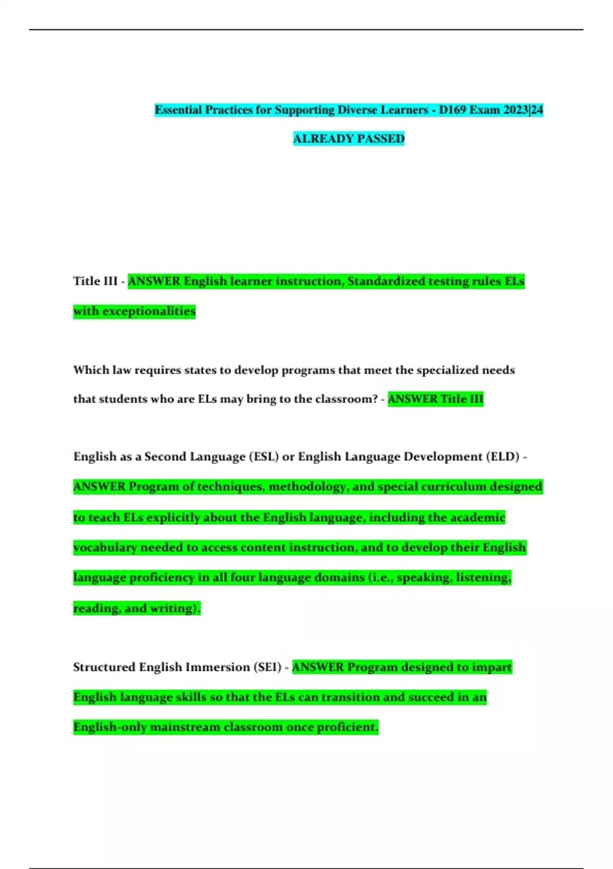 Essential Practices for Supporting Diverse Learners - D169 Exam 2023|24 ALREADY PASSED Title III - ANSWER English learner instruction, Standardized testing rules ELs with exceptionalities Which law requires states to develop programs that meet the specialized needs that students who are ELs may bring to the classroom? - ANSWER Title III English as a Second Language (ESL) or English Language Development (ELD) - ANSWER Program of techniques, methodology, and special curriculum designed to teach ELs explicitly about the English language, including the academic vocabulary needed to access content instruction, and to develop their English language proficiency in all four language domains (i.e., speaking, listening, reading, and writing). Structured English Immersion (SEI) - ANSWER Program designed to impart English language skills so that the ELs can transition and succeed in an English-only mainstream classroom once proficient. Title III requires schools to report on the number of ELs receiving services and their progress toward ________ and _________ - ANSWER language proficiency and content knowledge Which practice may reduce inappropriate over or under-identification of ELs for special education services? - ANSWER Consider the student's native literacy and language ESSA permits native language testing if it is necessary, and students can be exempted from the reading assessment during ___________ - ANSWER 1st year in the country What is WIDA? - ANSWER World-Class Instructional Design and Assessment What areas includes standards promoted by WIDA for describing how ELs should use language? - ANSWER Social and instructional language along with academic language in mathematics, science, and social studies Individuals with Disabilities Act (IDEA) - ANSWER This education law requires public schools to meet the unique needs of eligible K-12 students with disabilities. Schools do this by providing services.