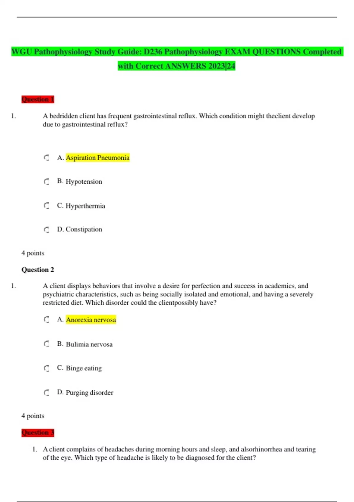 WGU Pathophysiology Study Guide: D236 Pathophysiology EXAM QUESTIONS Completed with Correct ANSWERS 2023|24 Question 1 1. A bedridden client has frequent gastrointestinal reflux. Which condition might theclient develop due to gastrointestinal reflux? A. Aspiration Pneumonia B. Hypotension C. Hyperthermia D. Constipation 4 points Question 2 1. A client displays behaviors that involve a desire for perfection and success in academics, and psychiatric characteristics, such as being socially isolated and emotional, and having a severely restricted diet. Which disorder could the clientpossibly have? A. Anorexia nervosa B. Bulimia nervosa C. Binge eating D. Purging disorder 4 points Question 3 1. A client complains of headaches during morning hours and sleep, and alsorhinorrhea and tearing of the eye. Which type of headache is likely to be diagnosed for the client? A. Tension headache B. Migraine C. Cluster headache D. Cephalgia 4 points Question 4 1. A client has +3 pitting edema on the feet and also has ascites. What is the mostimportant clinical feature to be monitored given this condition? A. Hemoglobin level B. Serum albumin level C. Red blood cells count D. White blood cells count 4 points Question 5 1. Which is a physical assessment finding of respiratory acidosis? A. Cyanosis B. Tachycardia C. Hypotension D. Hypertension 4 points Question 6 1. The nurse practitioner is assessing the medical records of different clients withdia