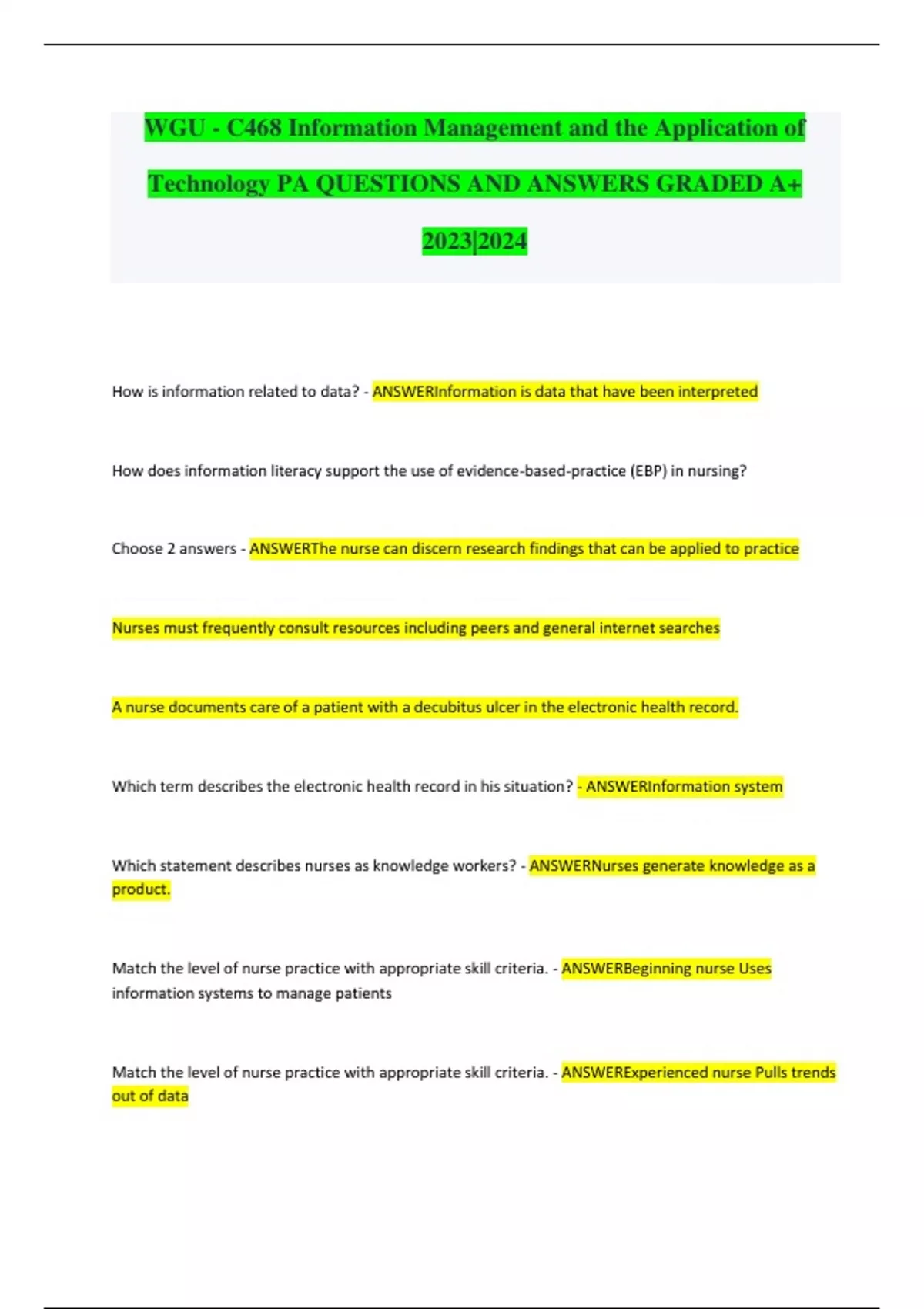 WGU - C468 Information Management and the Application of Technology PA QUESTIONS AND ANSWERS GRADED A+ 2023|2024 How is information related to data? - ANSWERInformation is data that have been interpreted How does information literacy support the use of evidence-based-practice (EBP) in nursing? Choose 2 answers - ANSWERThe nurse can discern research findings that can be applied to practice Nurses must frequently consult resources including peers and general internet searches A nurse documents care of a patient with a decubitus ulcer in the electronic health record. Which term describes the electronic health record in his situation? - ANSWERInformation system Which statement describes nurses as knowledge workers? - ANSWERNurses generate knowledge as a product. Match the level of nurse practice with appropriate skill criteria. - ANSWERBeginning nurse Uses information systems to manage patients Match the level of nurse practice with appropriate skill criteria. - ANSWERExperienced nurse Pulls trends out of data Match the level of nurse practice with appropriate skill criteria. - ANSWERInformatics innovator Generates informatics theory Match the level of nurse practice with appropriate skill criteria. - ANSWERInformatics nurse specialist Focuses on nursing's information needs The RN who works in the area of informatics Informatics nurse - ANSWERInformatics nurse Has an interest or experience, but no formal training in informatics - ANSWERInformatics nurse Plays an active role in research and theory development - ANSWERInformatics nurse specialist Has advanced graduate training in nursing informatics - ANSWERInformatics nurse speicalist Ensures that information is disseminated at appropriate times for appropriate uses - ANSWERInformatics nurse Which of the following uses database applications to sift through large amounts of data and looks for previously hidden trends? - ANSWERData min