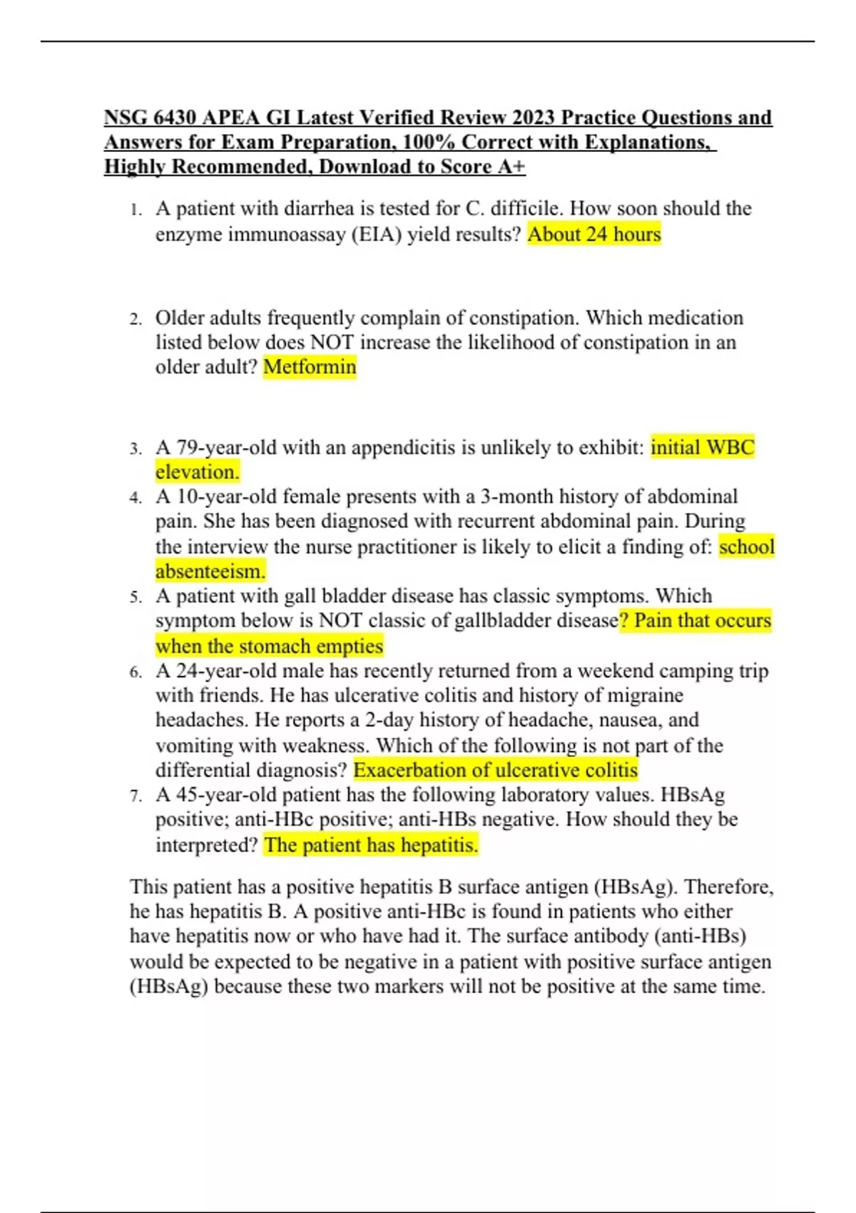 NSG 6430 APEA GI Latest Verified Review 2023 Practice Questions and Answers for Exam Preparation, 100% Correct with Explanations, Highly Recommended, Download to Score A+ 1. A patient with diarrhea is tested for C. difficile. How soon should the enzyme immunoassay (EIA) yield results? About 24 hours 2. Older adults frequently complain of constipation. Which medication listed below does NOT increase the likelihood of constipation in an older adult? Metformin 3. A 79-year-old with an appendicitis is unlikely to exhibit: initial WBC elevation. 4. A 10-year-old female presents with a 3-month history of abdominal pain. She has been diagnosed with recurrent abdominal pain. During the interview the nurse practitioner is likely to elicit a finding of: school absenteeism. 5. A patient with gall bladder disease has classic symptoms. Which symptom below is NOT classic of gallbladder disease? Pain that occurs when the stomach empties 6. A 24-year-old male has recently returned from a weekend camping trip with friends. He has ulcerative colitis and history of migraine headaches. He reports a 2-day history of headache, nausea, and vomiting with weakness. Which of the following is not part of the differential diagnosis? Exacerbation of ulcerative colitis 7. A 45-year-old patient has the following laboratory values. HBsAg positive; anti-HBc positive; anti-HBs negative. How should they be interpreted? The patient has hepatitis. This patient has a positive hepatitis B surface antigen (HBsAg). Therefore, he has hepatitis B. A positive anti-HBc is found in patients who either have hepatitis now or who have had it. The surface antibody (anti-HBs) would be expected to be negative in a patient with positive surface antigen (HBsAg) because these two markers will not be positive at the same time. 8. What medication listed below could be used to increase appetite in an anorexic patient? Megestrol 9. A patient is in the clinic with a 36- hour history of diarrhea and moderate dehydration. Interventions should include: oral rehydration with an electrolyte replenishment solution. 10. A 56-year-old male patient has been diagnosed with an inguinal hernia. What symptom would make the nurse practitioner suspect an incarcerated hernia? PAIN