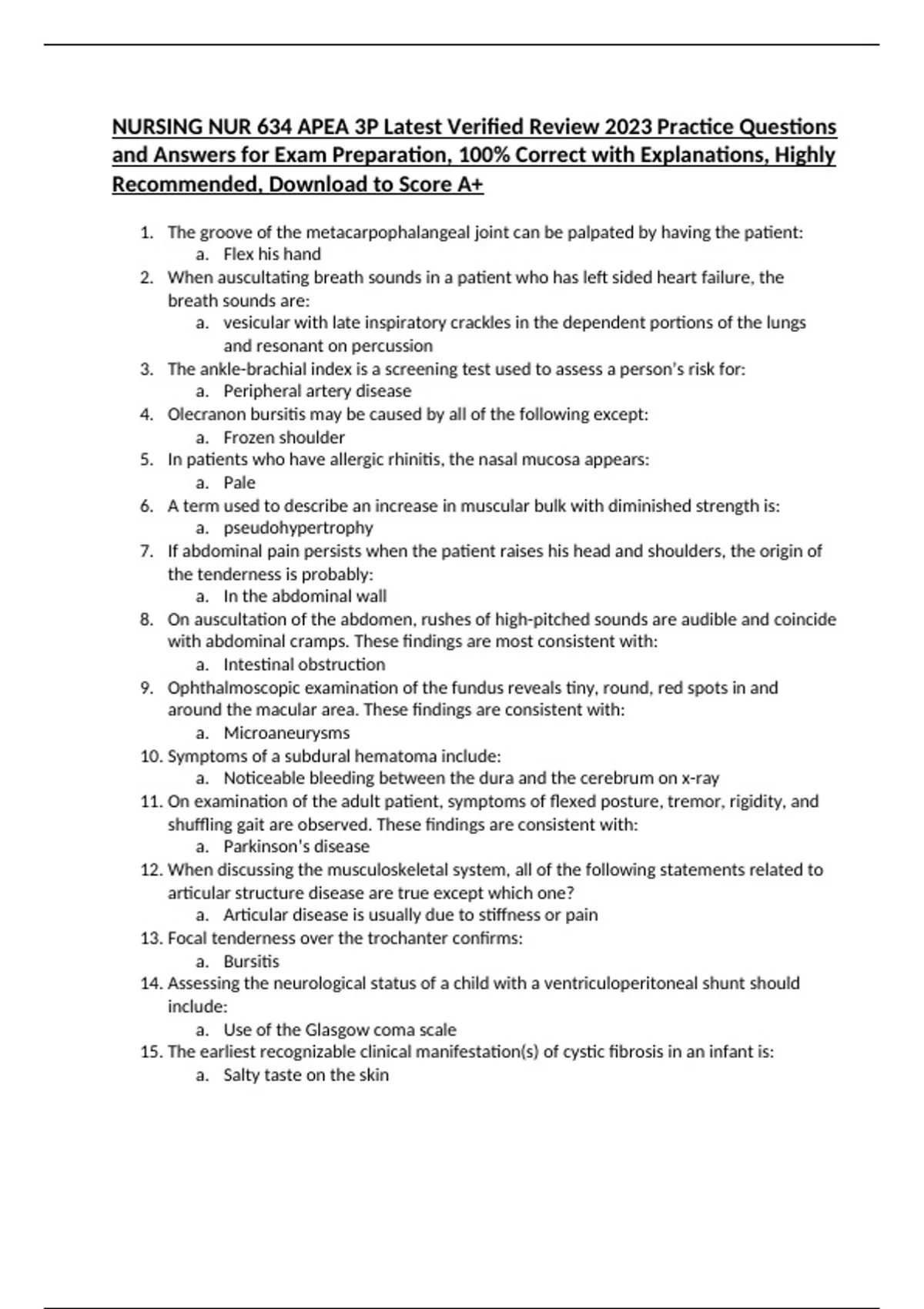 NURSING NUR 634 APEA 3P Latest Verified Review 2023 Practice Questions and Answers for Exam Preparation, 100% Correct with Explanations, Highly Recommended, Download to Score A+ 1. The groove of the metacarpophalangeal joint can be palpated by having the patient: a. Flex his hand 2. When auscultating breath sounds in a patient who has left sided heart failure, the breath sounds are: a. vesicular with late inspiratory crackles in the dependent portions of the lungs and resonant on percussion 3. The ankle-brachial index is a screening test used to assess a person’s risk for: a. Peripheral artery disease 4. Olecranon bursitis may be caused by all of the following except: a. Frozen shoulder 5. In patients who have allergic rhinitis, the nasal mucosa appears: a. Pale 6. A term used to describe an increase in muscular bulk with diminished strength is: a. pseudohypertrophy 7. If abdominal pain persists when the patient raises his head and shoulders, the origin of the tenderness is probably: a. In the abdominal wall 8. On auscultation of the abdomen, rushes of high-pitched sounds are audible and coincide with abdominal cramps. These findings are most consistent with: a. Intestinal obstruction 9. Ophthalmoscopic examination of the fundus reveals tiny, round, red spots in and around the macular area. These findings are consistent with: a. Microaneurysms 10. Symptoms of a subdural hematoma include: a. Noticeable bleeding between the dura and the cerebrum on x-ray